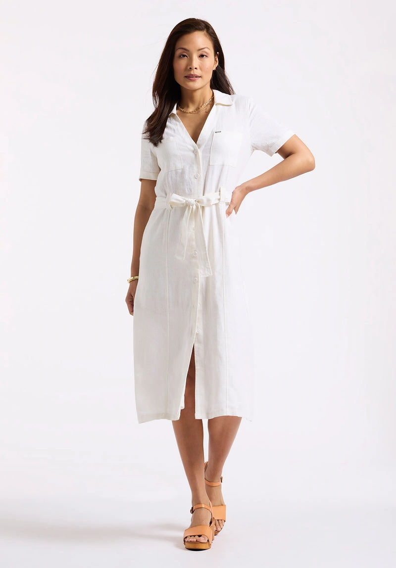Classic and comfy! This lightweight white midi dress has a neat collar, short sleeves, and a flattering waist tie for the perfect fit. Features front buttons and handy patch pockets — stylish and practical. Great for brunch, weekends, or sunny days out. Easy to dress up with heels or keep casual with sandals.