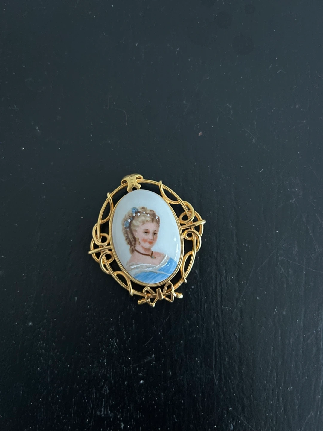 Selling a lovely Limoges France cameo brooch. It features a portrait of a woman in a blue dress and has a gold-tone frame. The back is marked "Made in Limoges France". It's in like new condition and ready to wear!