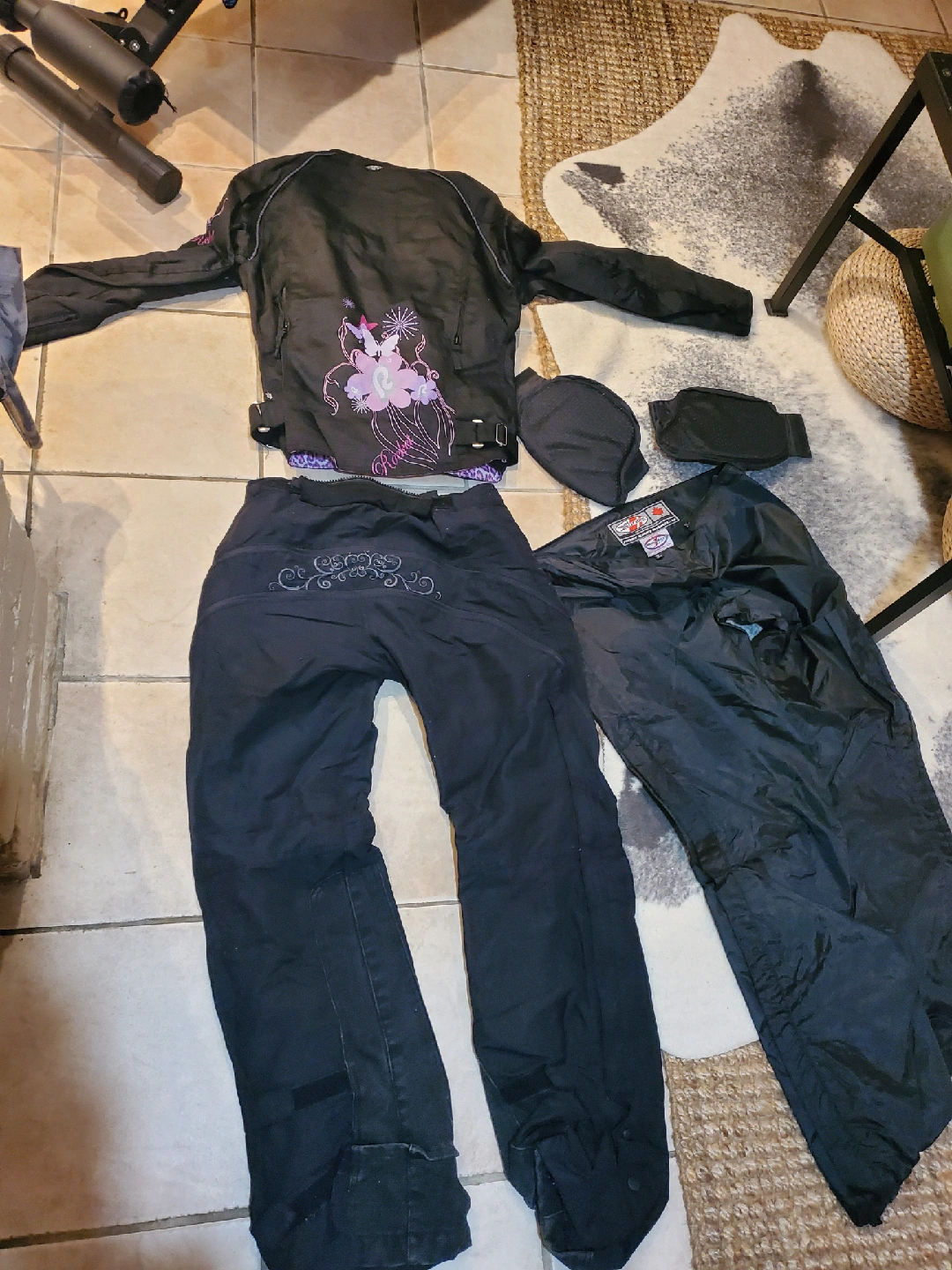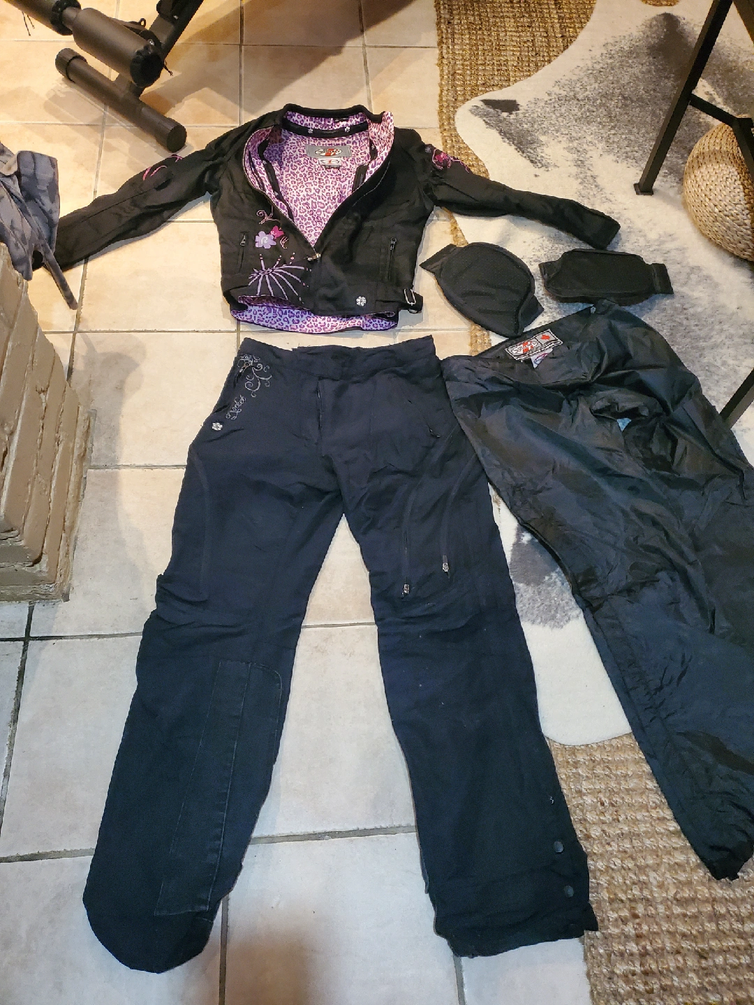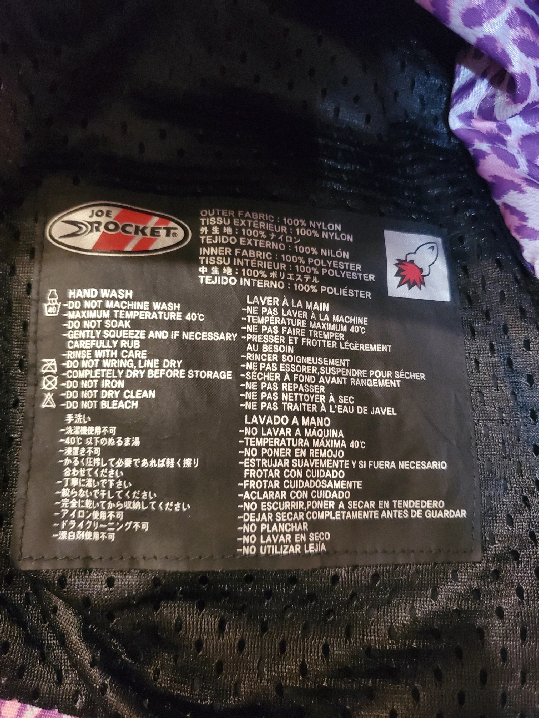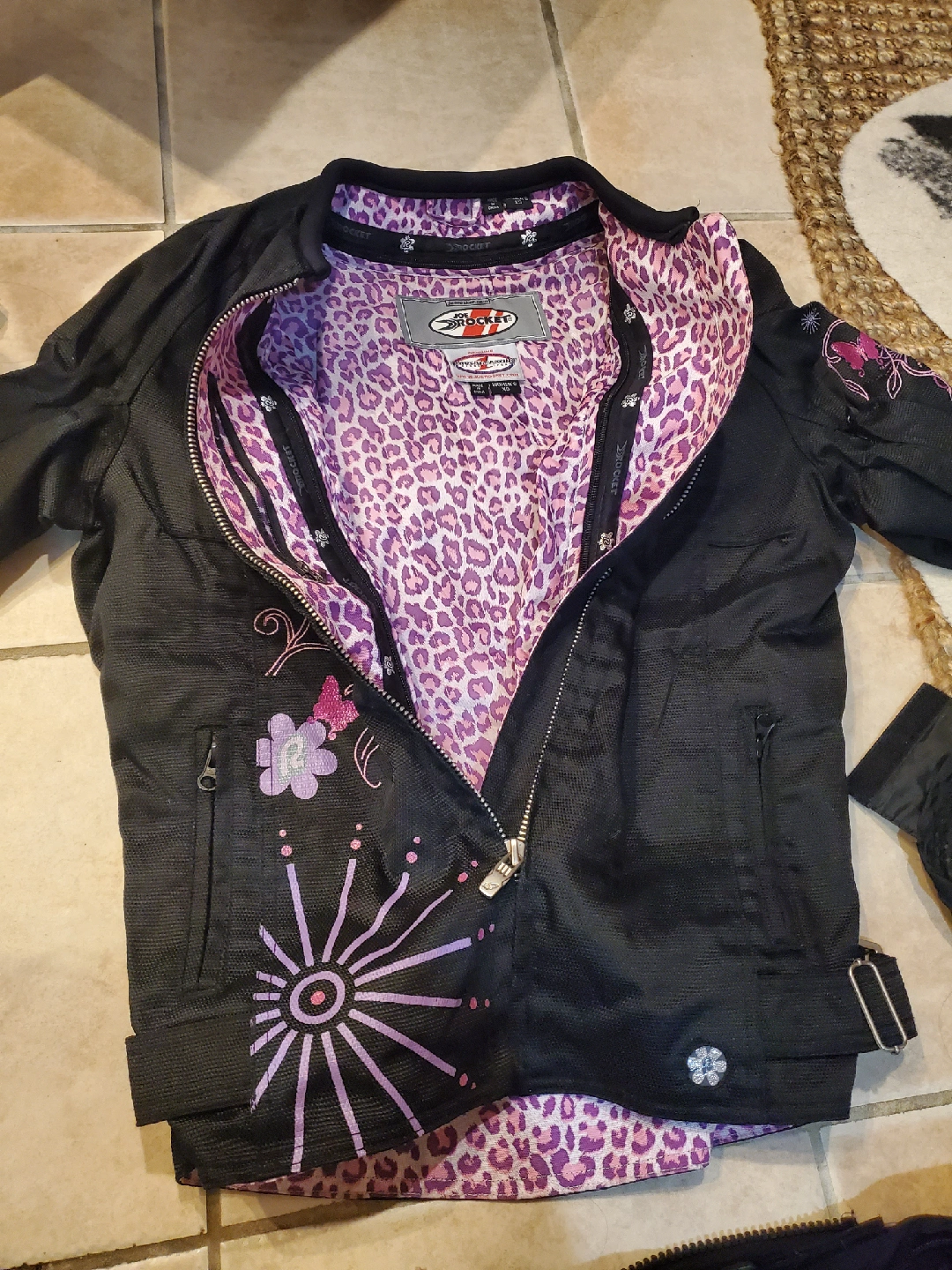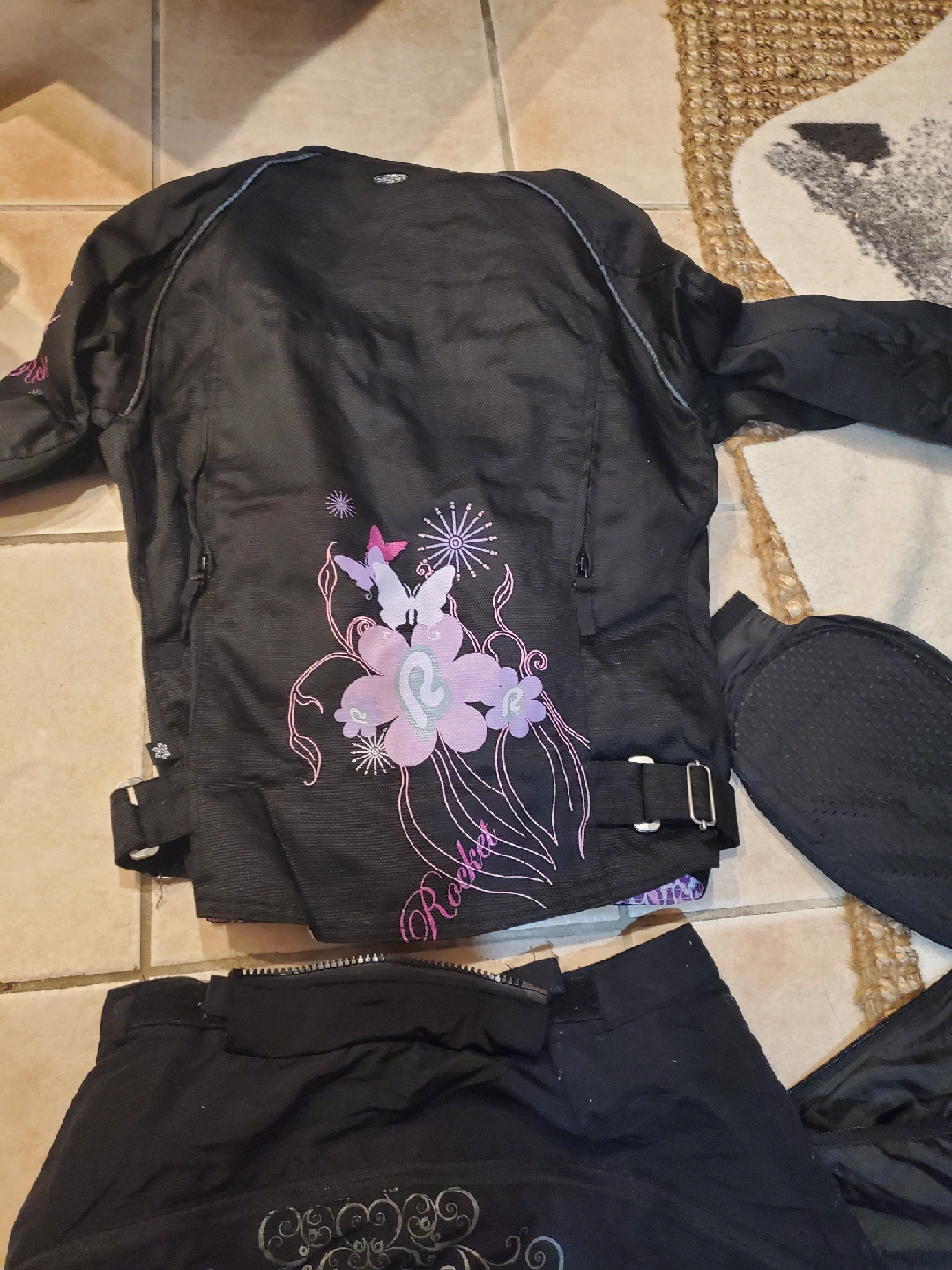 60Selling a Joe Rocket women's jacket and pants set in size XS( jacket), pants, size S. The jacket has a fun purple and pink leopard print removable lining. The jacket is proudly designed in Canada! Great for motorcycle riding or other outdoor activities like snowboarding! The pants come with extra water proof shell. I'm 5'2" and 125lbs