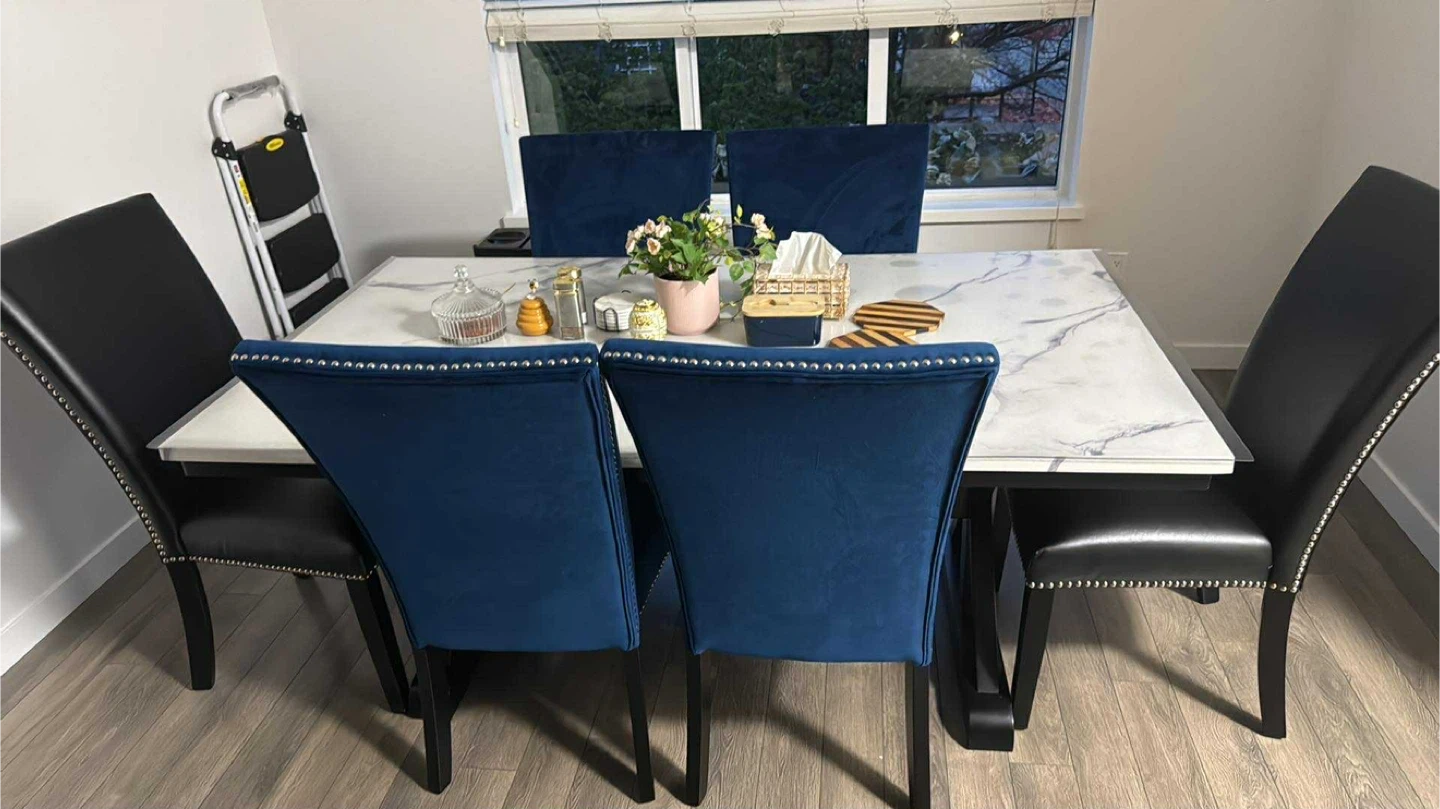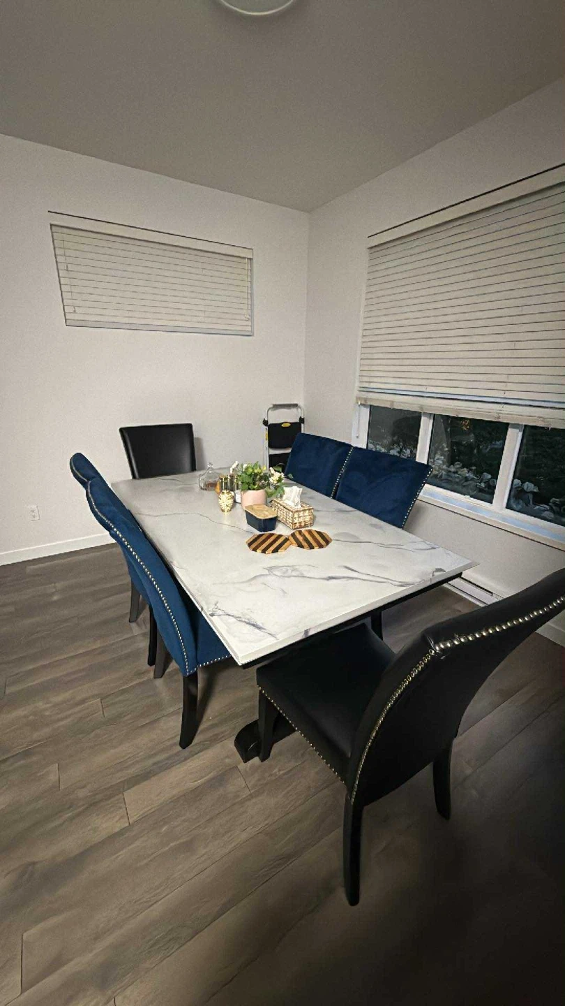 Selling a comfy grey sectional sofa with a recliner at both ends! It's in great shape and ready for a new home. Also selling a dining table set with blue velvet chairs and black leather chairs. The table has a white marble top and a black base. Perfect for family dinners or entertaining guests! Reason for selling - we are downsizing.