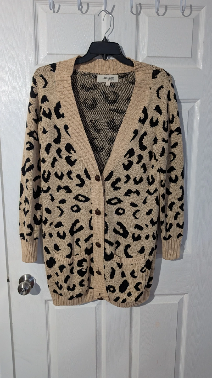 10Cute Morgan de Toi cardigan with a fun leopard print! It's a beige colour with black spots, perfect for adding a bit of flair to your outfit