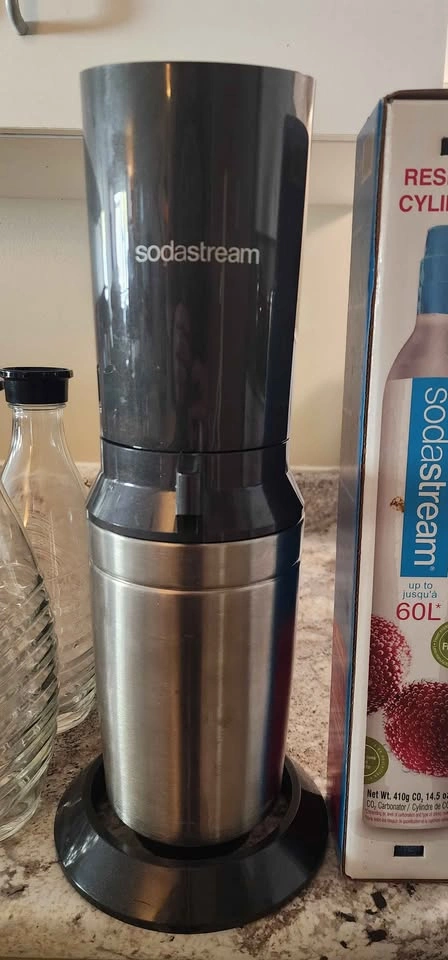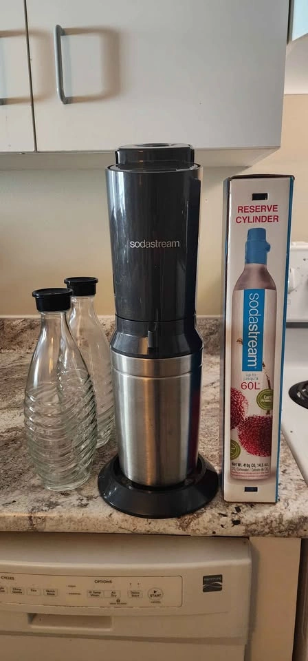 Only used a handful of times, this elegant soda maker (likely a Source/Crystal model) is in perfect condition and ready to make sparkling water instantly. Features include the simple push-button carbonation and a quick snap-lock bottle mechanism. The kit comes complete with two reusable, dishwasher-safe glass carafes (much classier than plastic!) and a spare, new-in-box 60L CO2 cylinder for tons of bubbles right out of the gate. Save money and ditch plastic bottles—get your bubbles today!