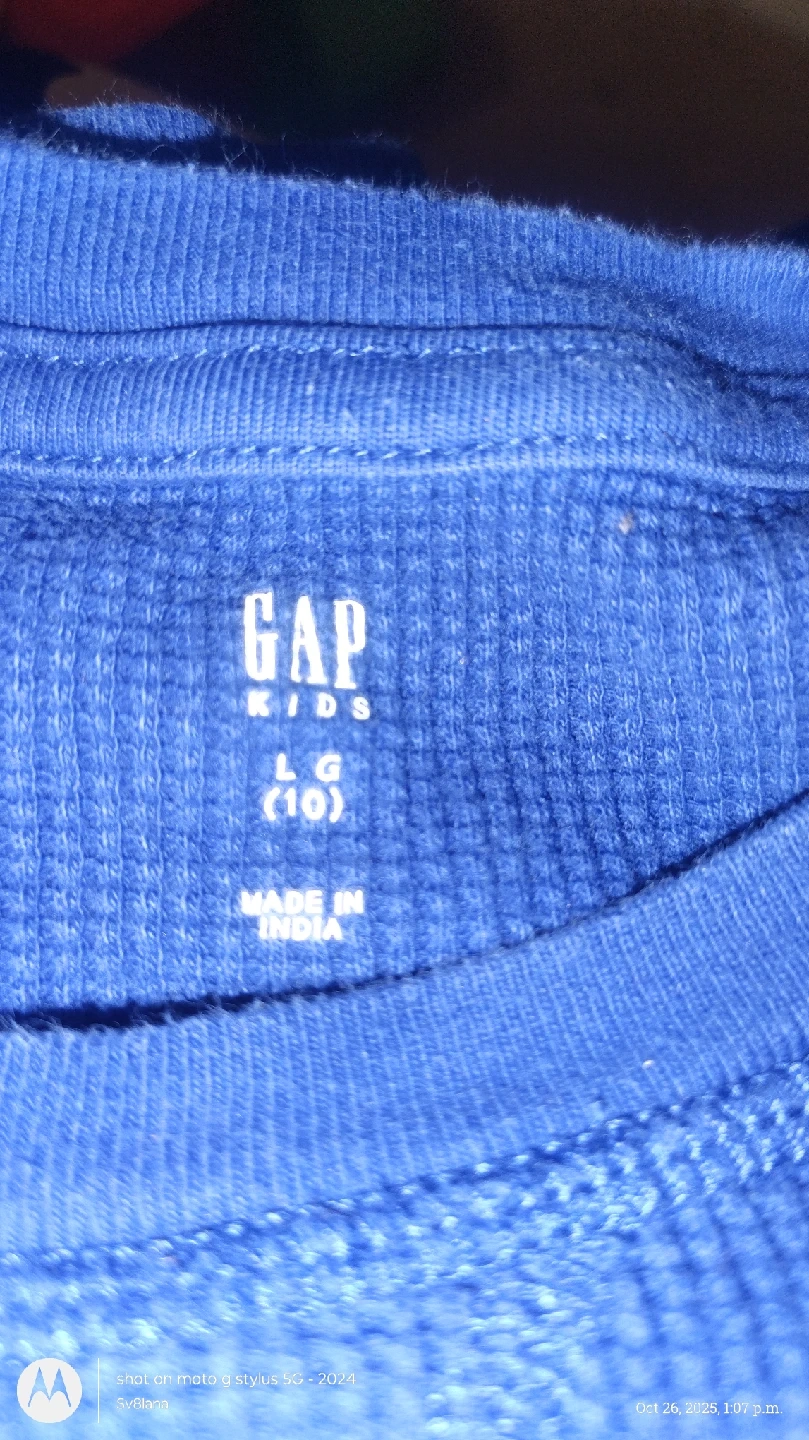 5Selling a comfy Gap Kids long-sleeved shirt in blue. It's a waffle knit material and in great condition. The size is L (10) for kids.