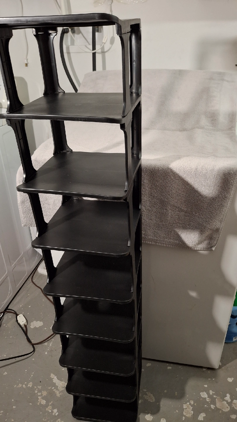 Selling a black shoe rack with 9 tiers! It's great for organizing your shoes and keeping them off the floor. It's in new condition and ready for a new home. Perfect for small spaces or anyone who wants to keep their entryway tidy