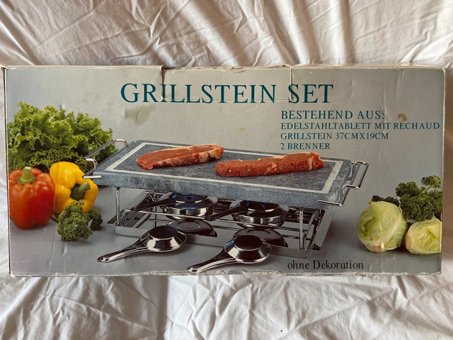 This is a Grillstein Set, including the stone, tray, burners and stands. This set is used and has some signs of wear, but is overall in good condition.