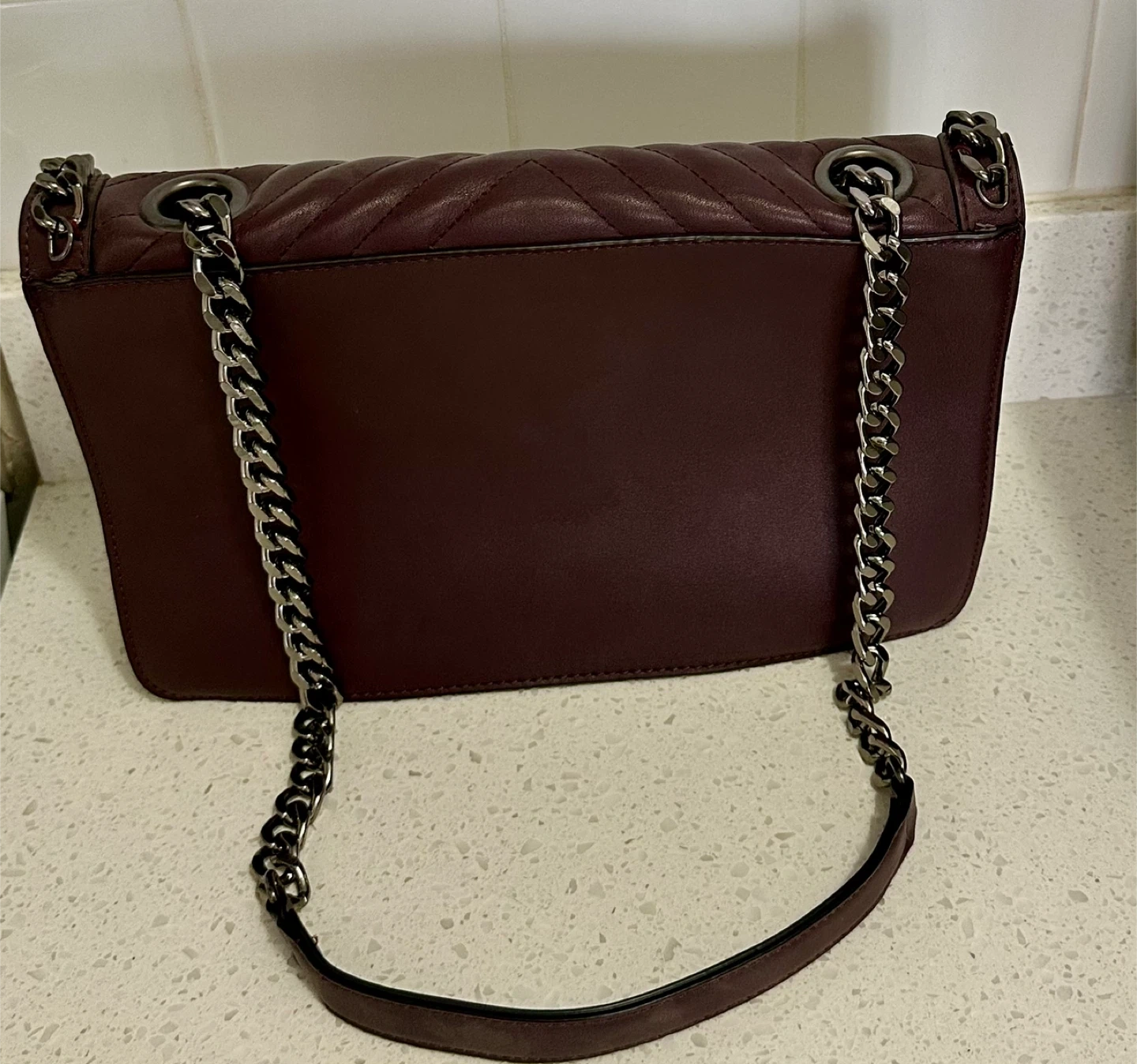 Selling a stylish Aldo shoulder bag in a beautiful burgundy colour! It features a quilted pattern and chain detailing. Perfect for adding a touch of elegance to any outfit