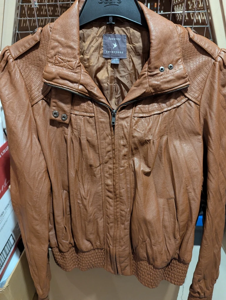 44Faux leather brown tan women's jacket for sale. Large size. Only worn a handful of times. From a smoke and pet free fome. $20 cash or best offer. for pickup in SE near McKenzie Towne.
