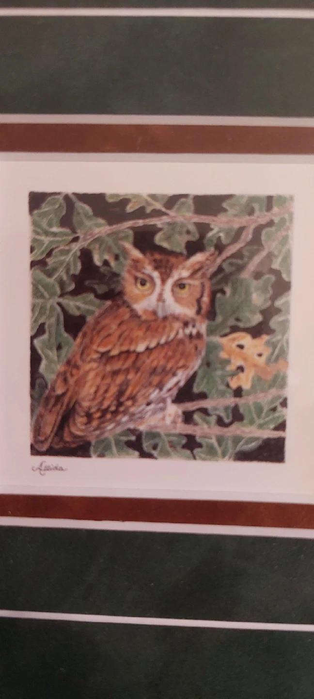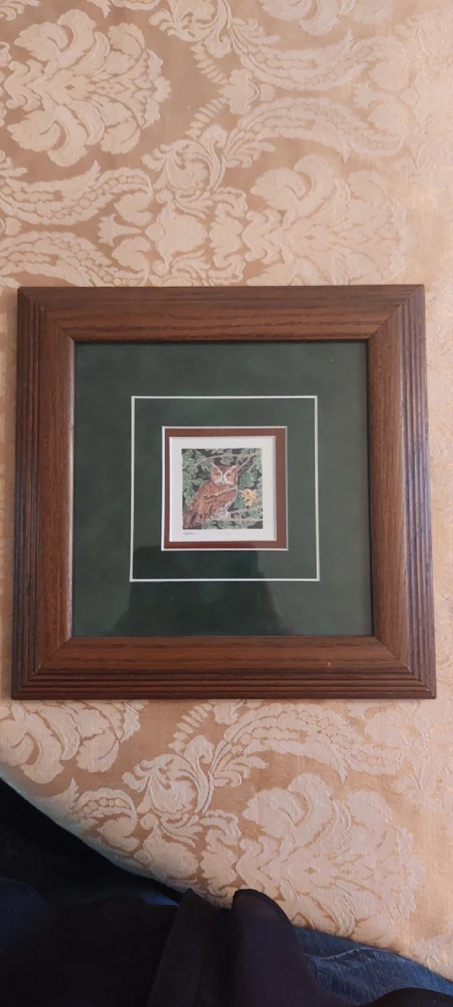 A lovely framed print featuring an owl. The frame is a nice wood tone and the print is in great condition. Perfect for adding a touch of nature to your home decor.