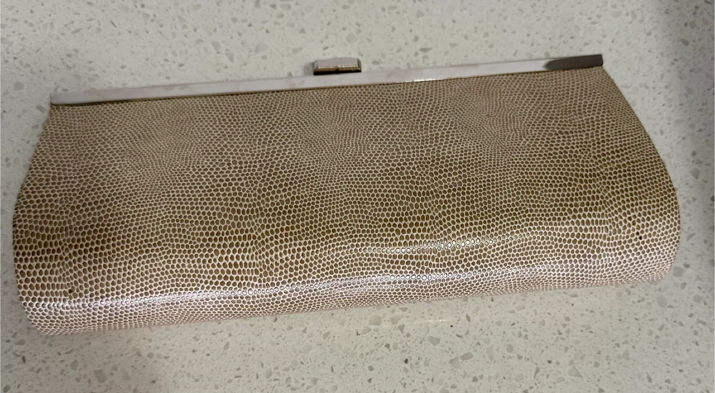 Selling a beautiful clutch purse. It is in great condition and perfect for a night out or special occasion. It has a unique textured pattern and a silver-tone clasp.