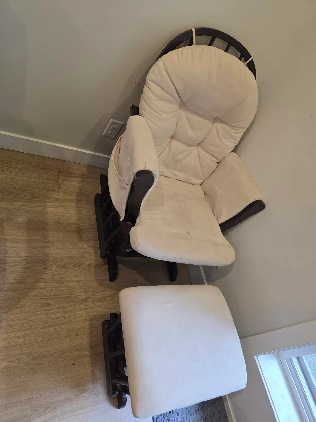 Selling a comfy glider rocking chair with a matching ottoman! It's in great shape and perfect for relaxing. The cushions are a soft beige colour. Would be great in a nursery or living room! every seat attachment is washable.