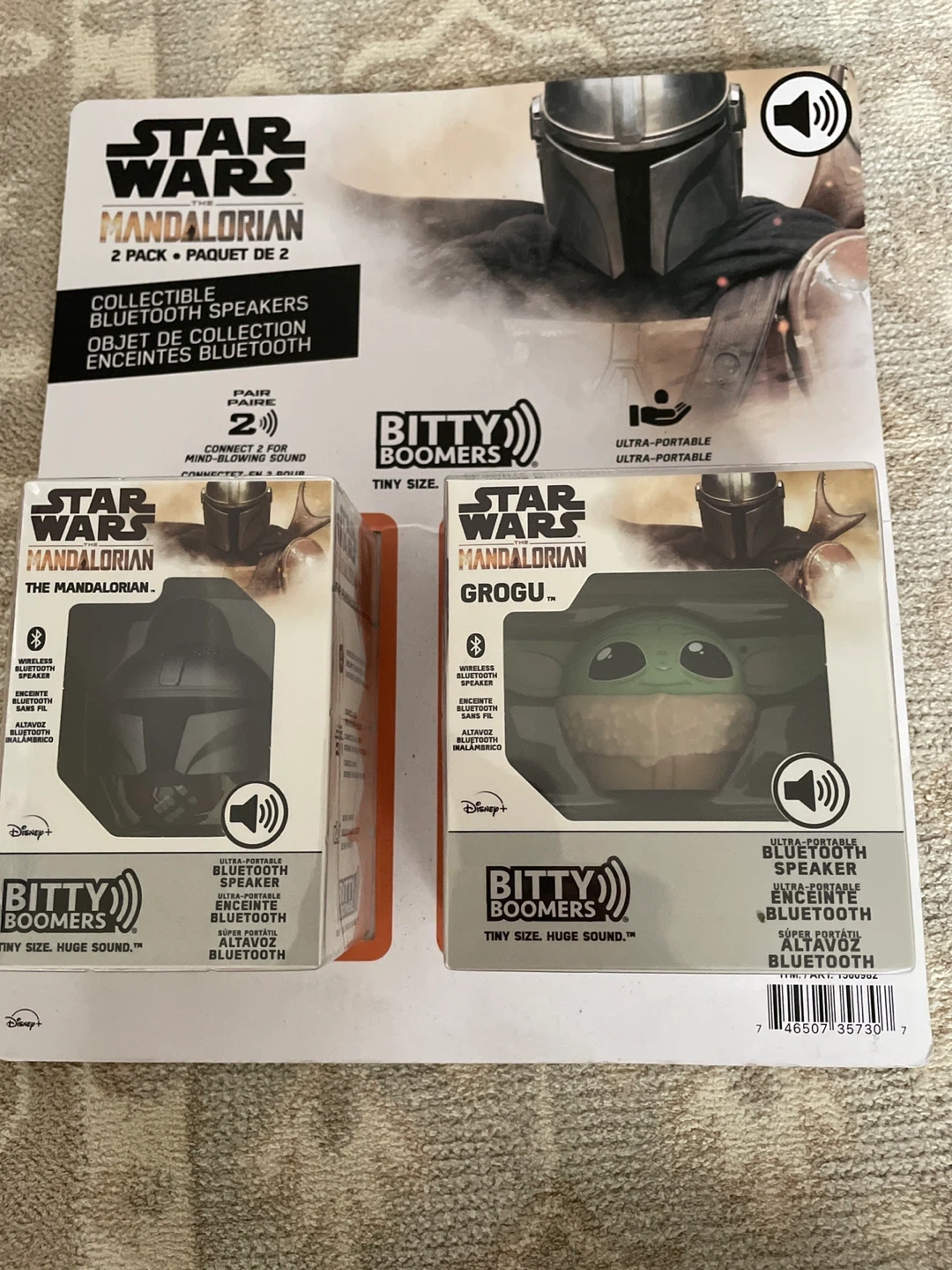 Early Christmas shopping! Selling a Star Wars Mandalorian Bitty Boomers 2-pack of collectible Bluetooth speakers! These ultra-portable speakers are small in size but make up for it with mind-blowing sound. Includes both The Mandalorian and Grogu.