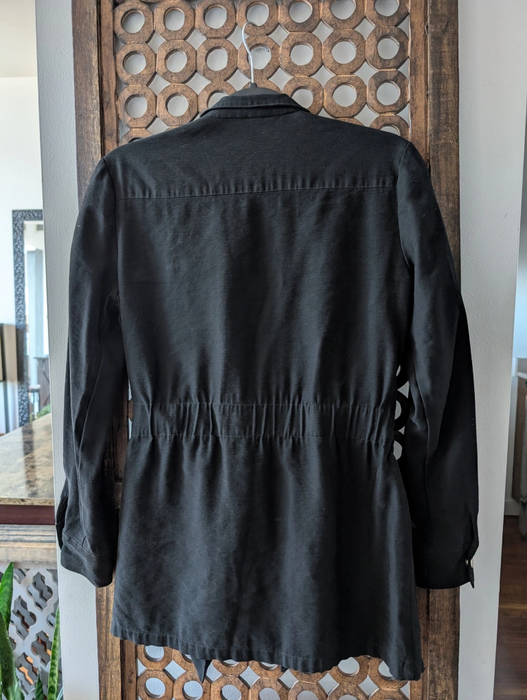 Black jacket/lightweight blazer from C by One. It's in great condition with a cute tie at the waist. Perfect for layering!
