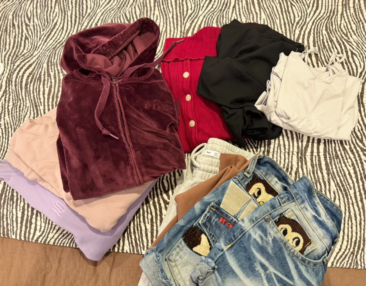 65Selling a bundle of assorted clothing items! Includes a PINK velvet hoodie, a red off-shoulder, a black top, an H&M sleeveless bodysuit, a light purple sweatshirt, grey TNA sweatpants, rose pants, and a pair of jean shorts. All items are in great condition and ready for a new home. Sizes from XXS to Medium
