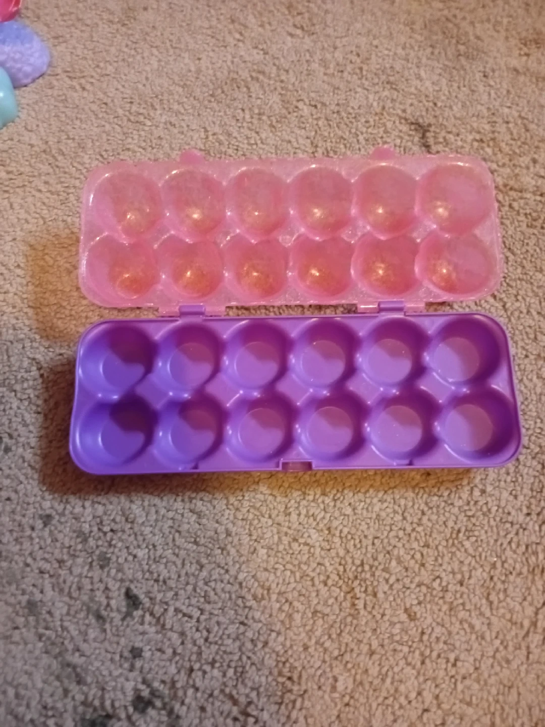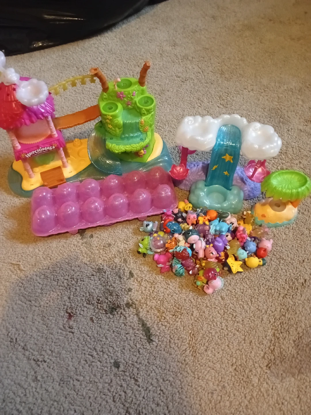 hand size comparison of a 14 year old, 51 total hatchimals, 1 hatchimal egg carrier for 12, preferably for kids ages 5 and up, as long as they don't eat small toys. comes with free fluffy pink sparkly bag thing if you want to make sure the hatchimals don't get scattered
