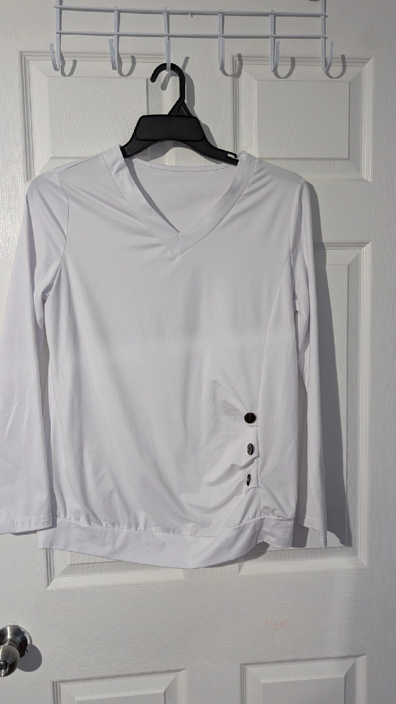 10Here's a cute white long-sleeve top! It features a V-neck and button detailing on the side. Perfect for layering or wearing on its own