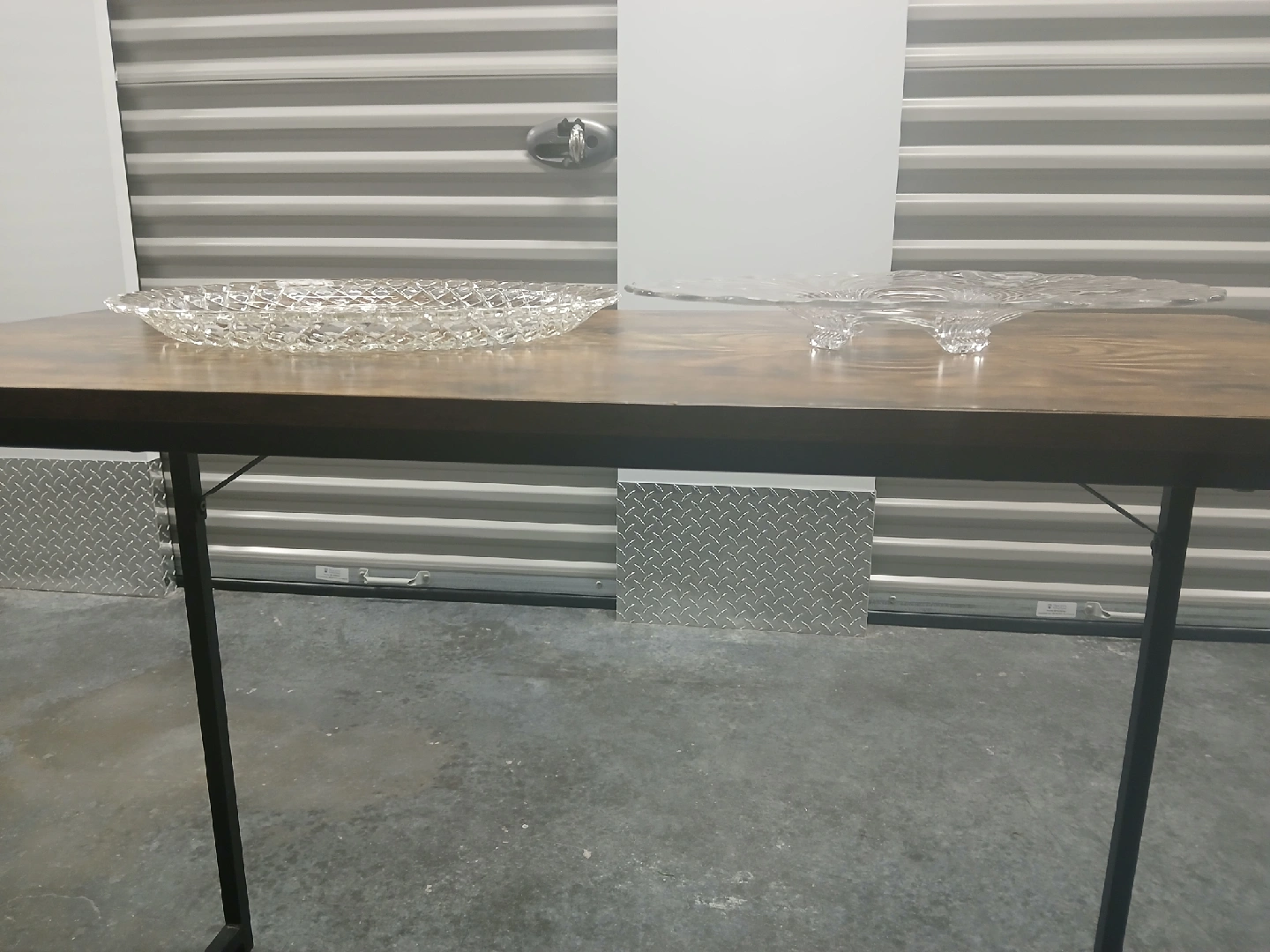 84Selling two decorative glass plates. One is an oval shaped plate with a diamond pattern. The other is a round glass plate with a ruffled edge and a pedestal base. Both are in good condition and would look great on a table or shelf