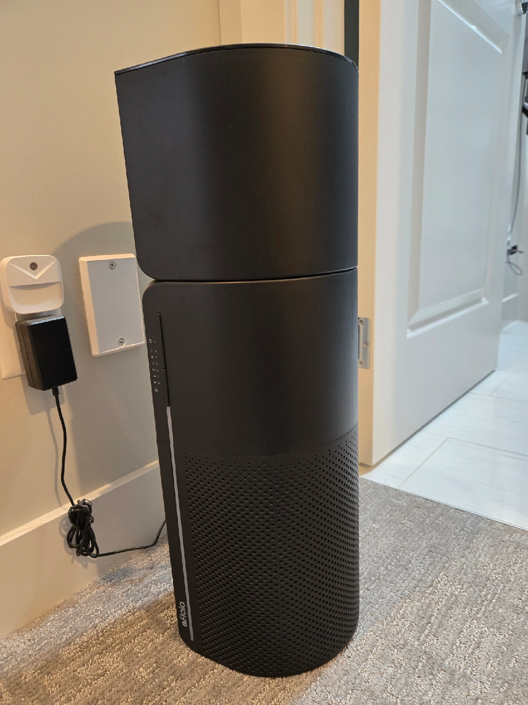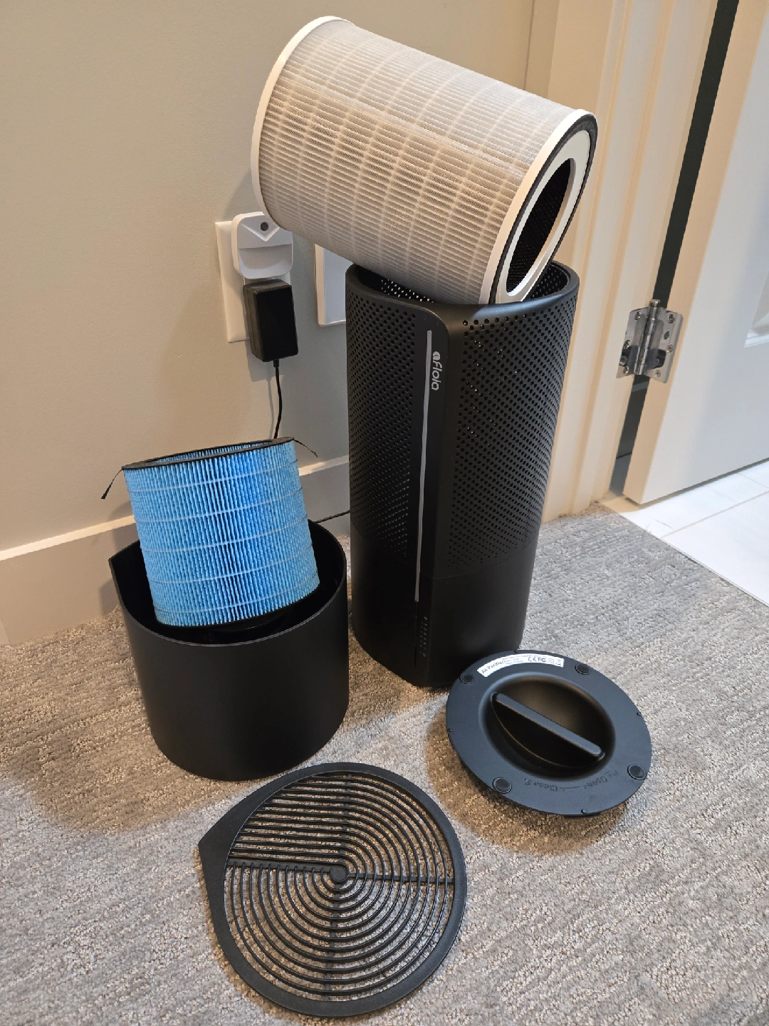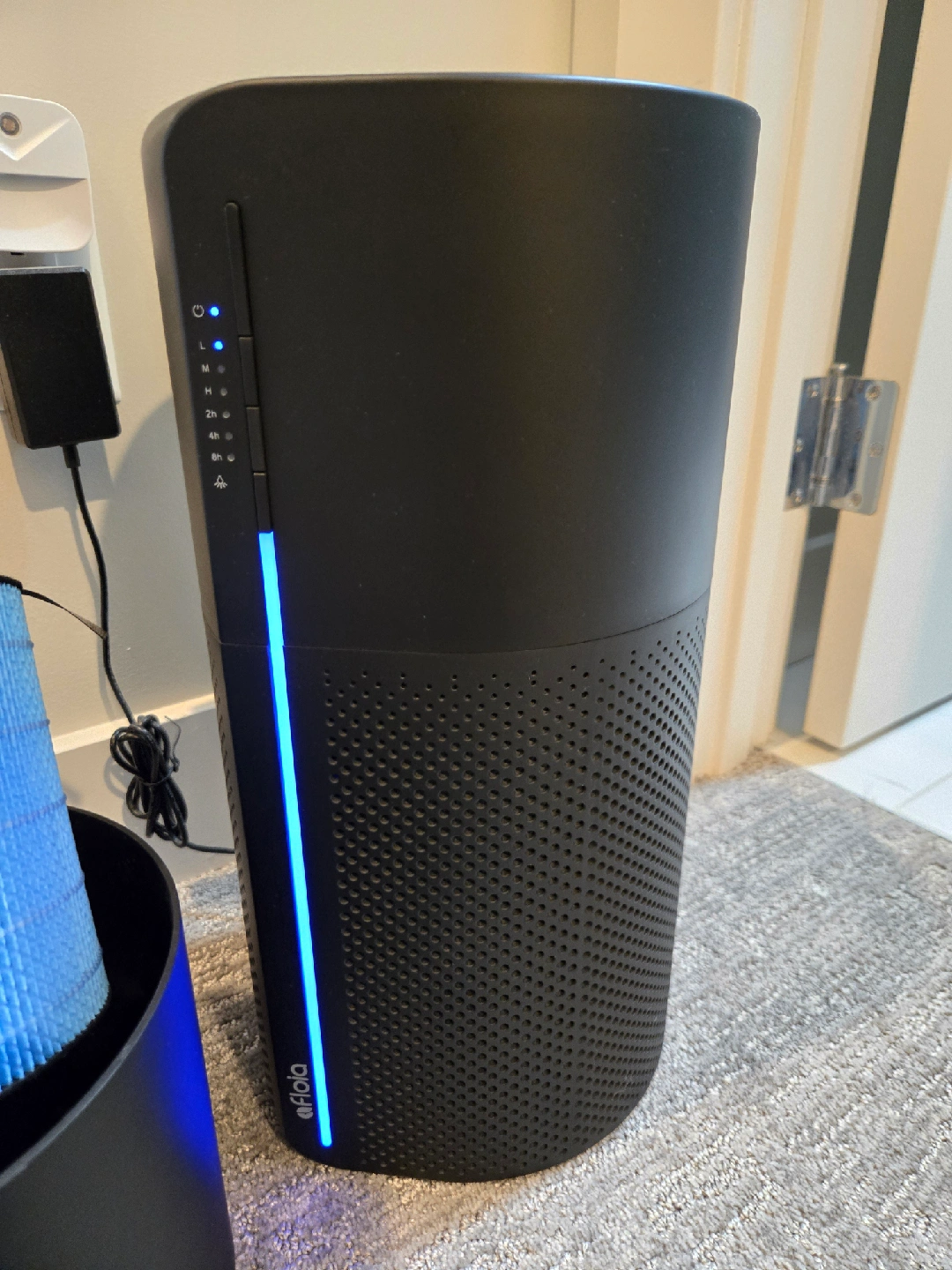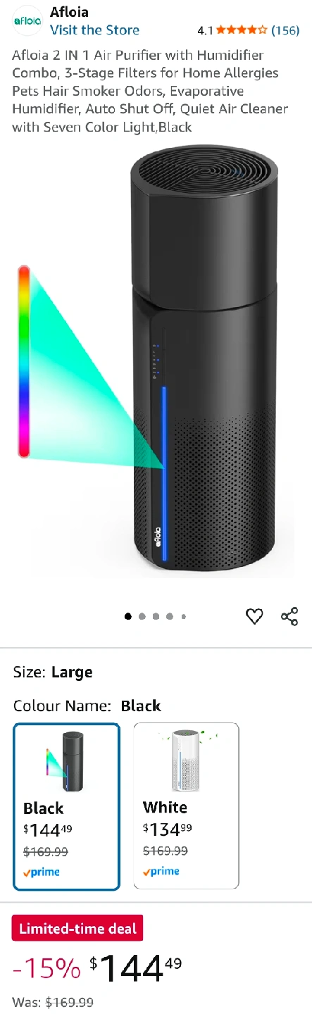 Selling an Afloia 2 IN 1 Air Purifier and Humidifier Combo in black. It features a 3-stage filter system designed for home allergies, pets, hair, and smoker odours. It also includes an evaporative humidifier with auto shut off and a quiet air cleaner with seven colour lights. Size: Large