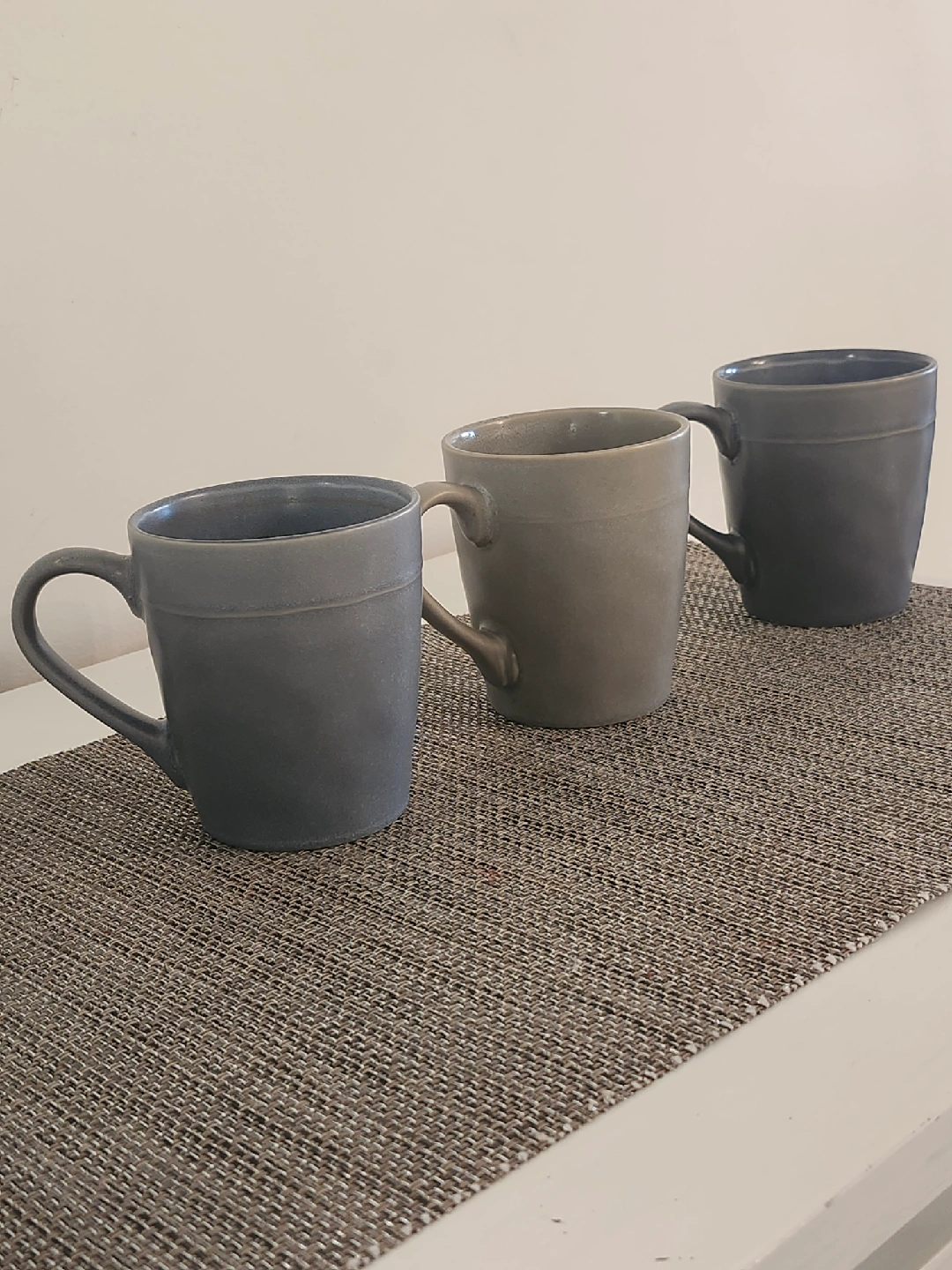 Selling a set of three CasaModena stoneware mugs in varying shades of grey and beige. They are in great condition and ready for your favourite warm beverages! They are also microwave and dishwasher safe
