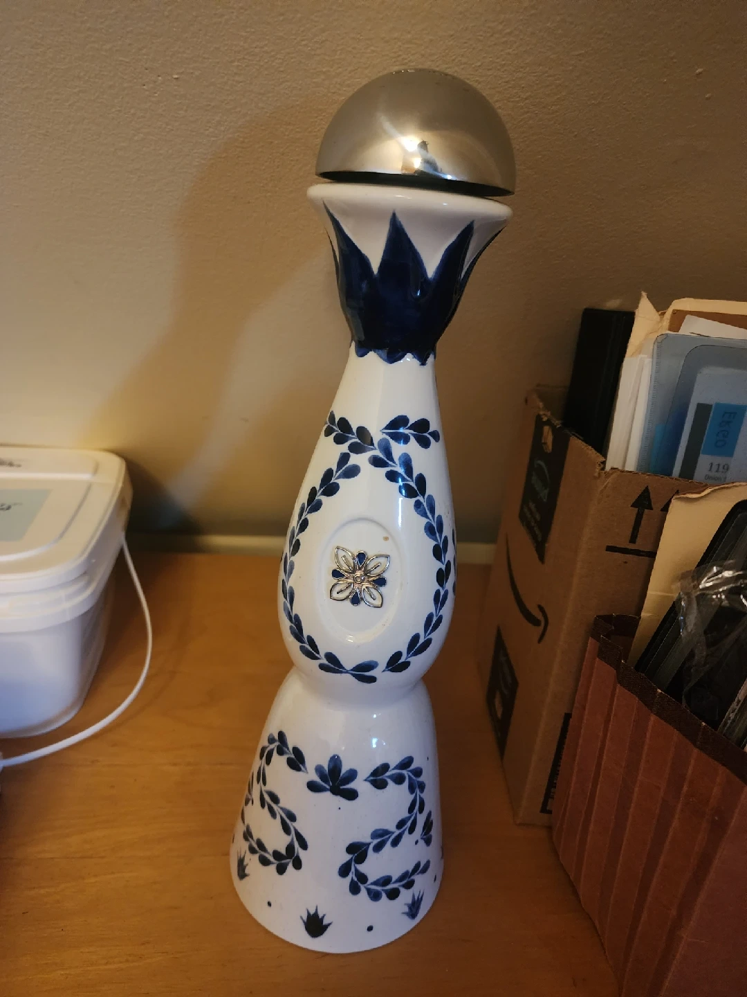 Selling a decorative Clase Azul tequila bottle. It's a beautiful piece with a white ceramic body and distinctive blue floral patterns with bell.