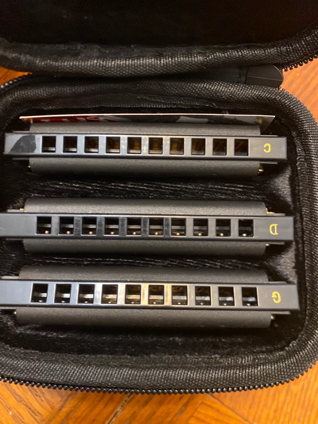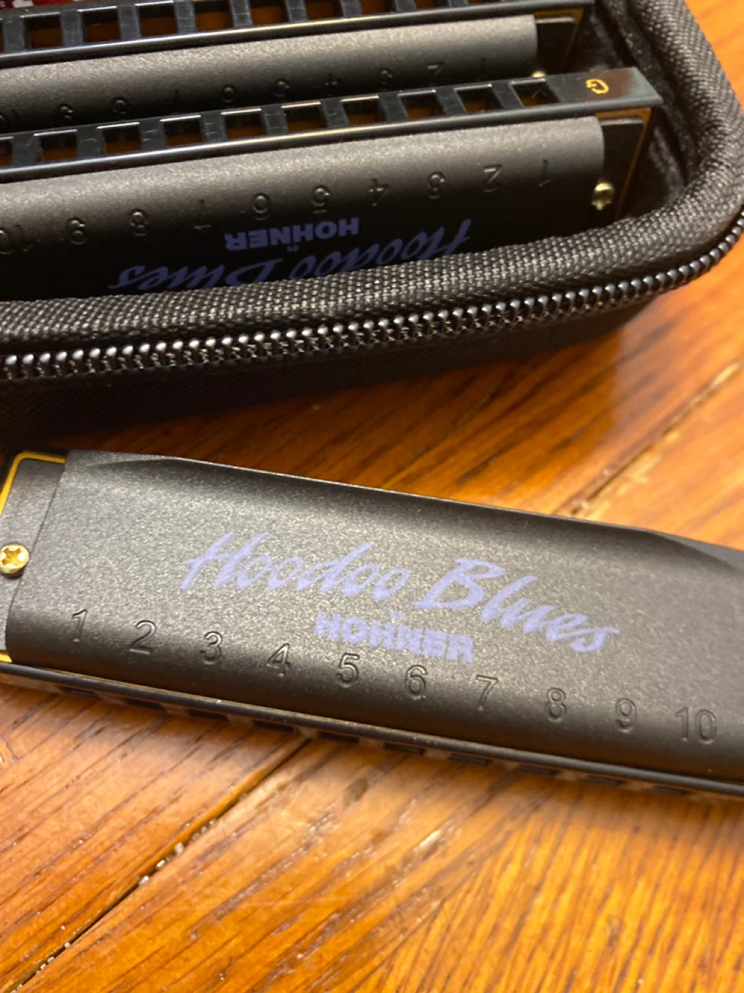 Selling a set of Hohner Hoodoo Blues harmonicas. They come in a convenient carrying case. The set includes harmonicas in the keys of C, D, and G. Great for any blues enthusiast!