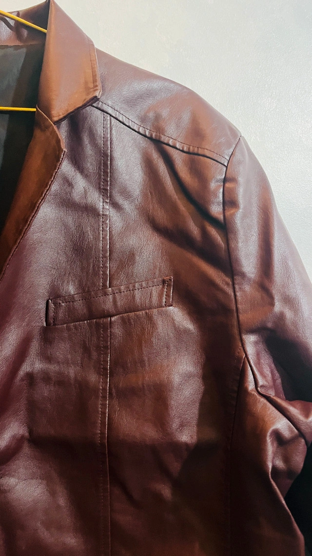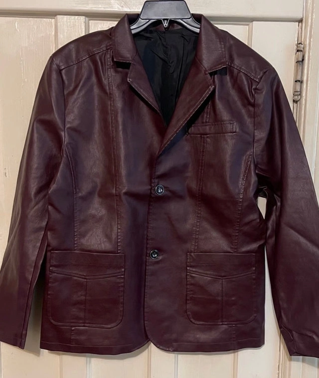 102This is a brand new stylish, men's burgundy faux leather blazer, perfect for adding a touch of sophistication to any outfit. This blazer features a classic button-down design. It's a great find for those looking for a distinctive, affordable fashion statement. Additional details: * Colour: Burgundy * Material: Faux Leather * Style: Blazer * Closure: Button If the ad is up, it's still available! Pick up is in Brampton near Sheridan College.