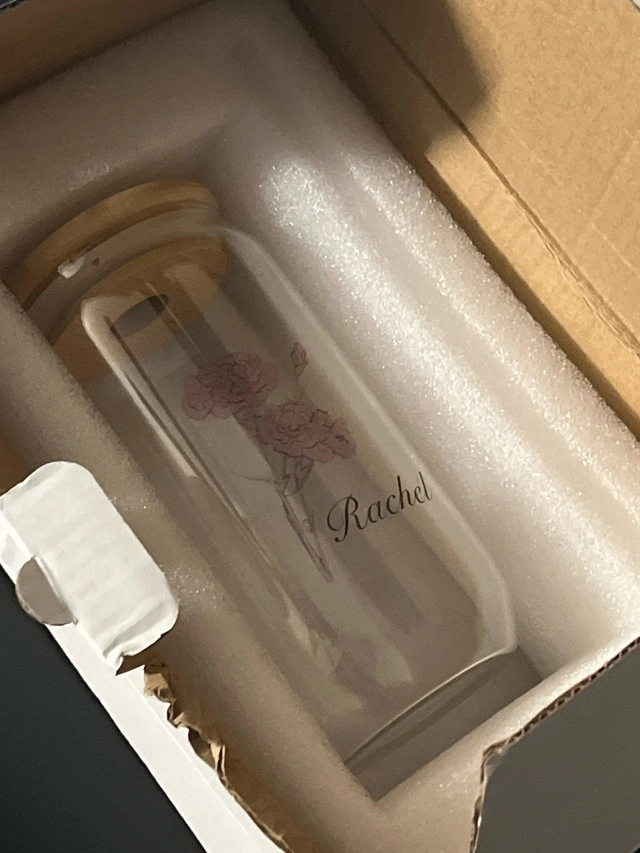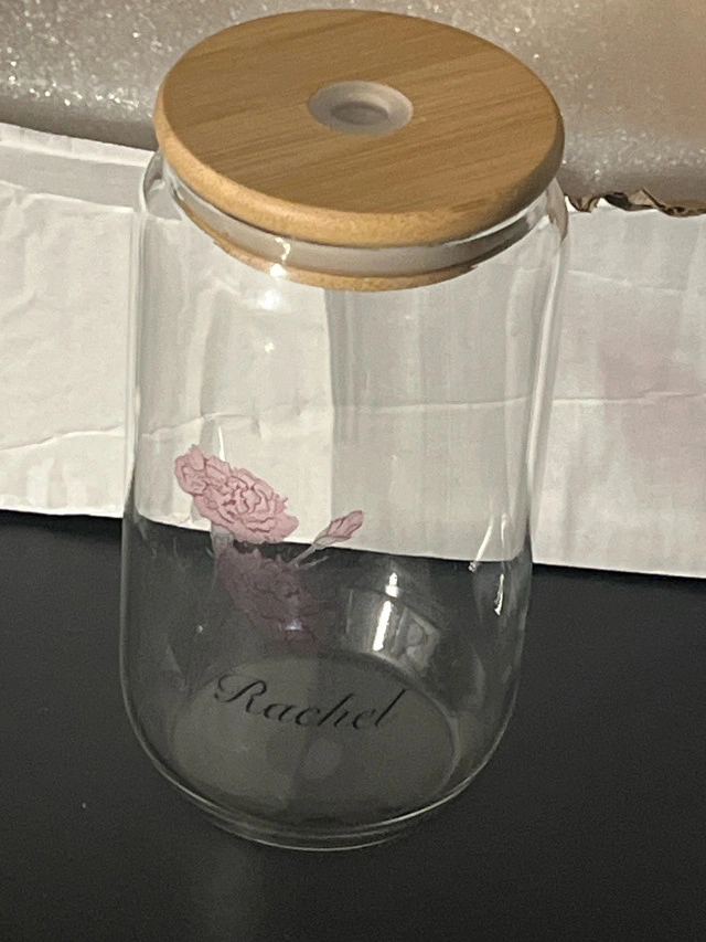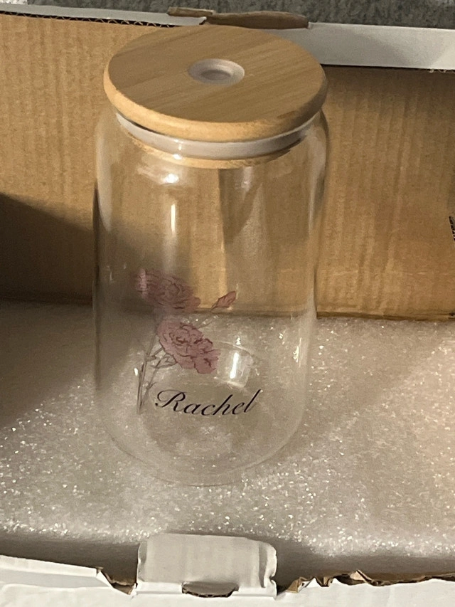 102This brand new 16-ounce personalized glass tumbler is perfect for your favourite iced drinks and features a bamboo lid and a straw. The glass features the name "Rachel" along with a floral design. * Capacity: 16 oz * Material: Glass * Lid: Bamboo * Design: Floral with custom name Looking to add a personal touch to your hydration? This tumbler is the bees knees! Also, just a friendly reminder: if you're seeing this ad, the tumbler is still up for grabs! Pick up is in Brampton near Sheridan College.
