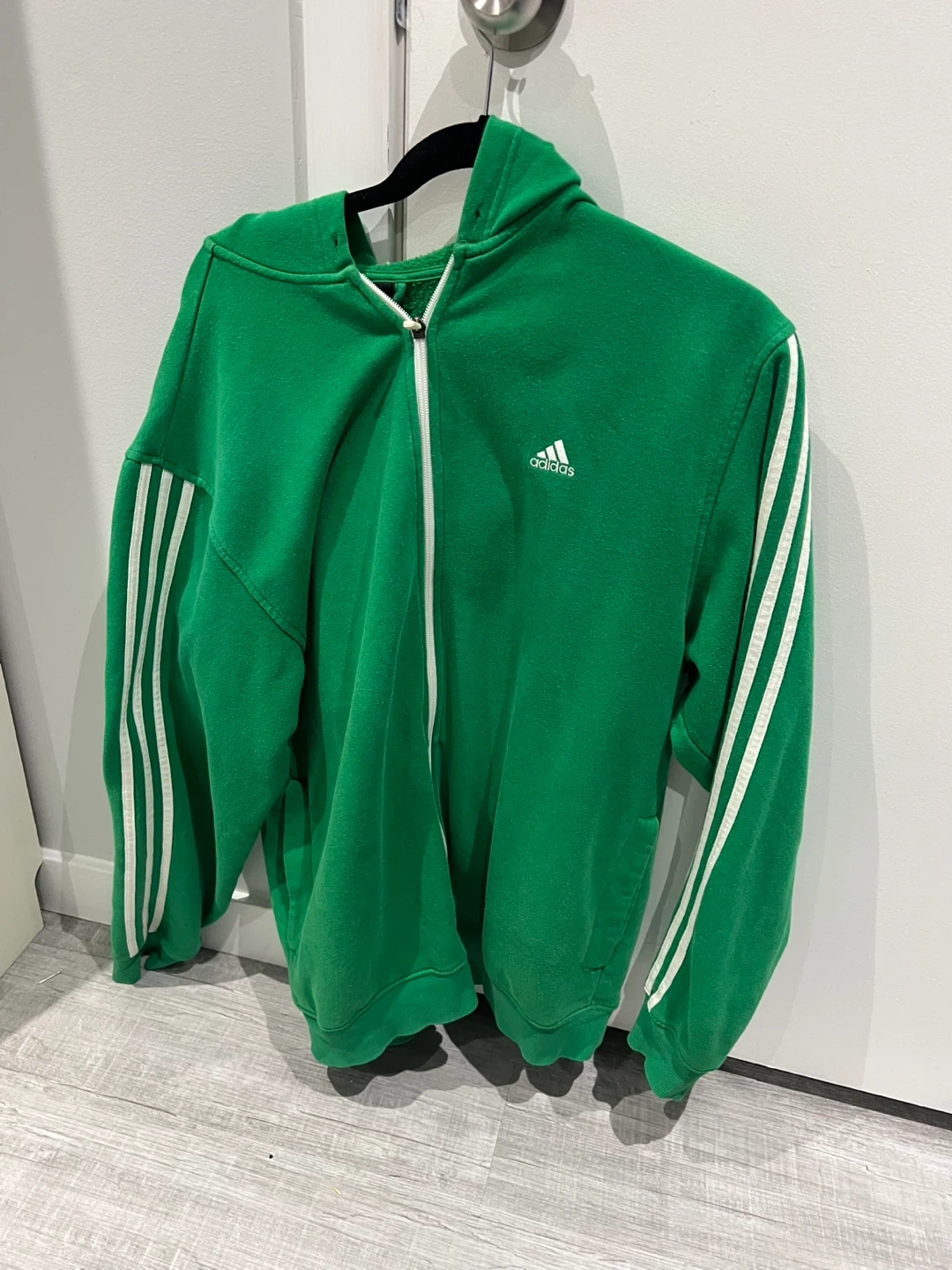 Here's an Adidas green zip-up hoodie for sale! It features the classic three stripes on the sleeves. A great addition to your casual wardrobe and a black and white golfing adidas shirt. Both for $80