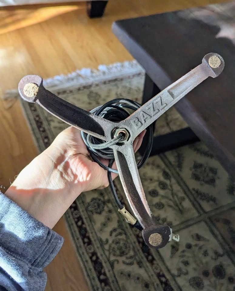 Set of two very cool looking solid cast iron lamp bases with a rugged, minimalist industrial design. Each features a tripod-style base with “BAZZ” (made in Montreal, Canada brand) embossed underneath and a dark bronze patina that gives them an authentic vintage look.