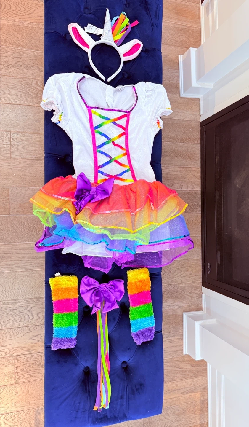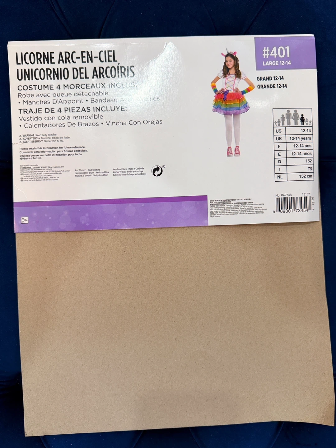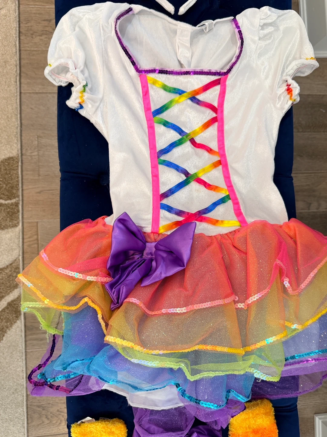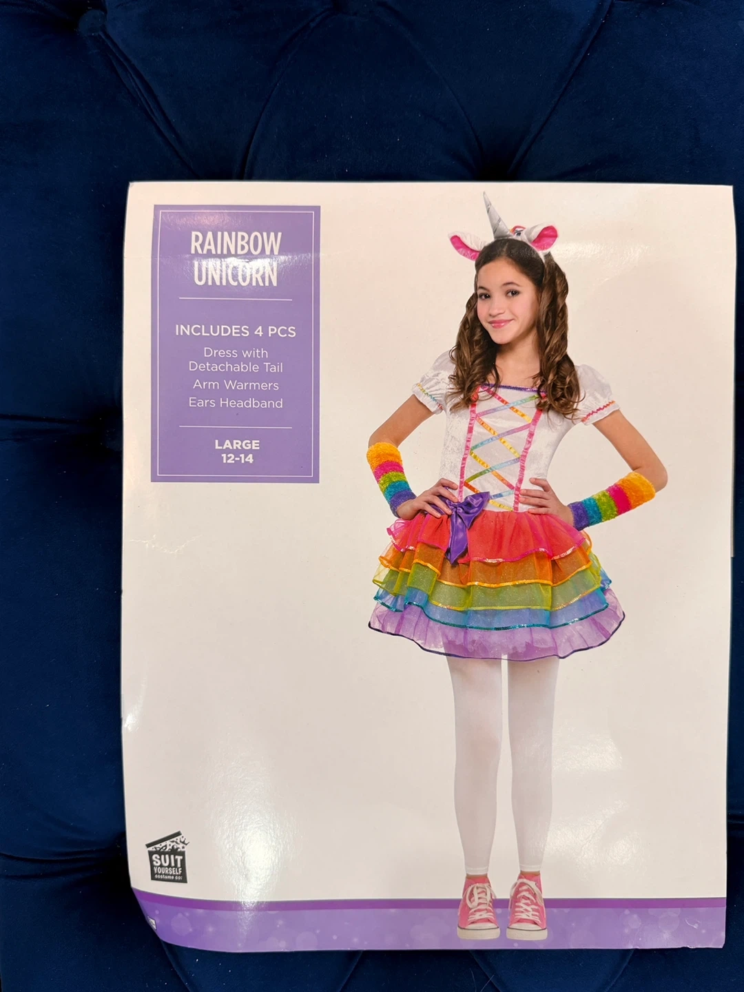 Selling a gently used rainbow unicorn costume, perfect for dress-up or Halloween! It's a size large (12-14) and includes four pieces: the dress with detachable tail, arm warmers, and ears headband. It's in great condition and ready for a new home!
