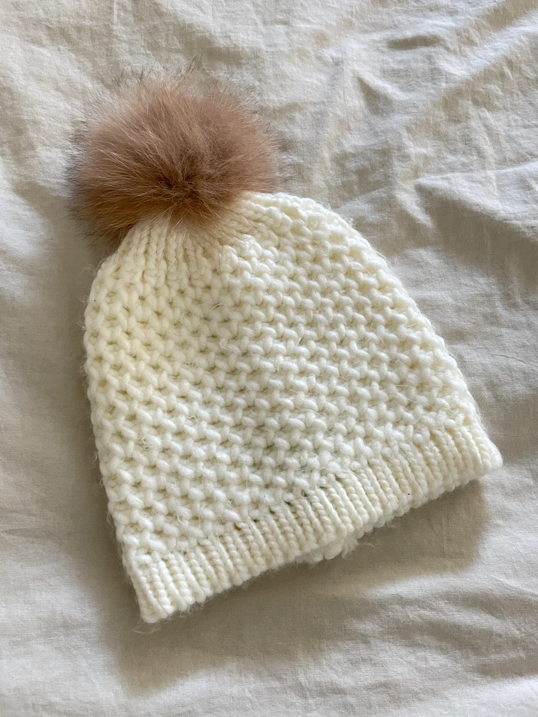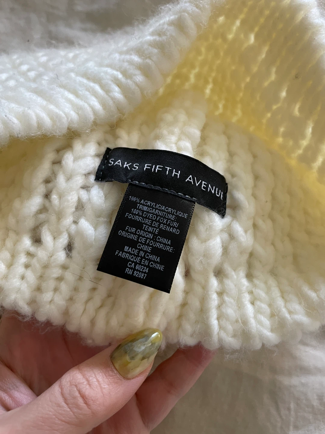 Cozy white knit beanie from Saks Fifth Avenue! It features a cute faux fur pom pom on top.