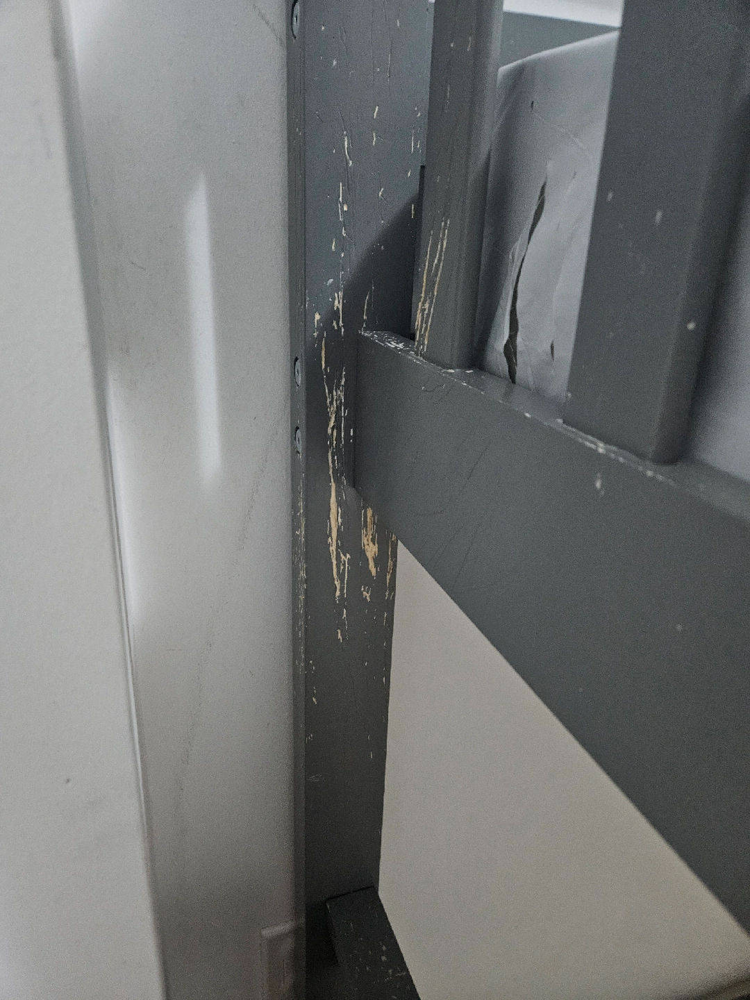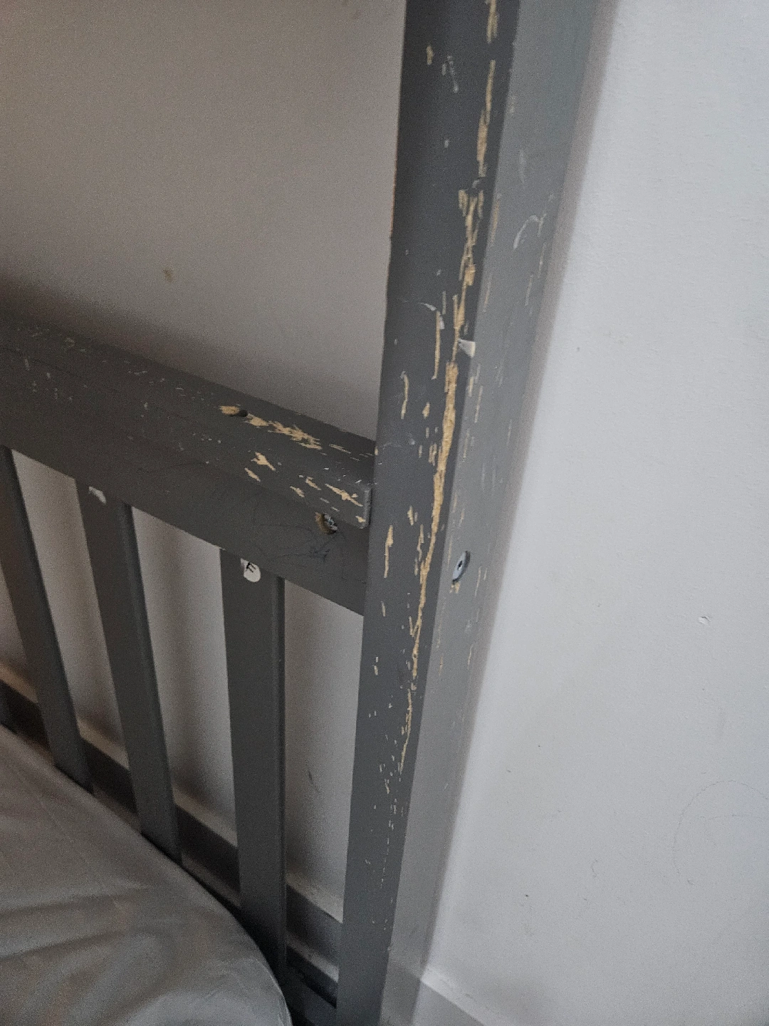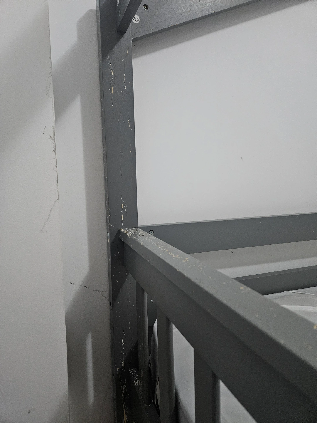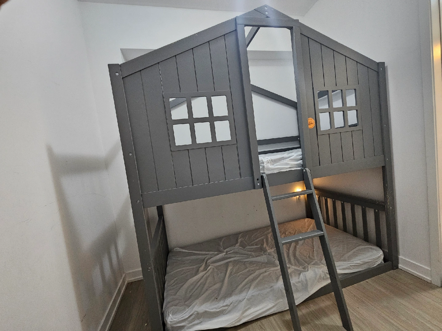 Selling a grey wooden bunk bed that has a cute house design on the top bunk! It has some signs of wear and tear (house with cats).