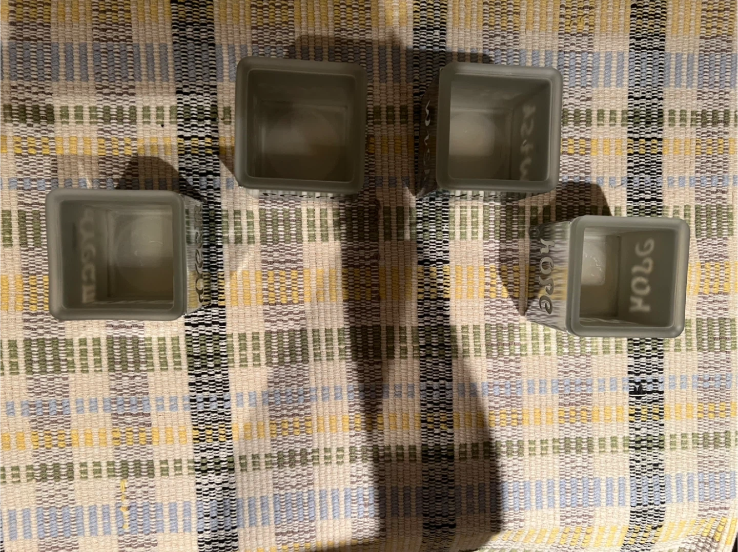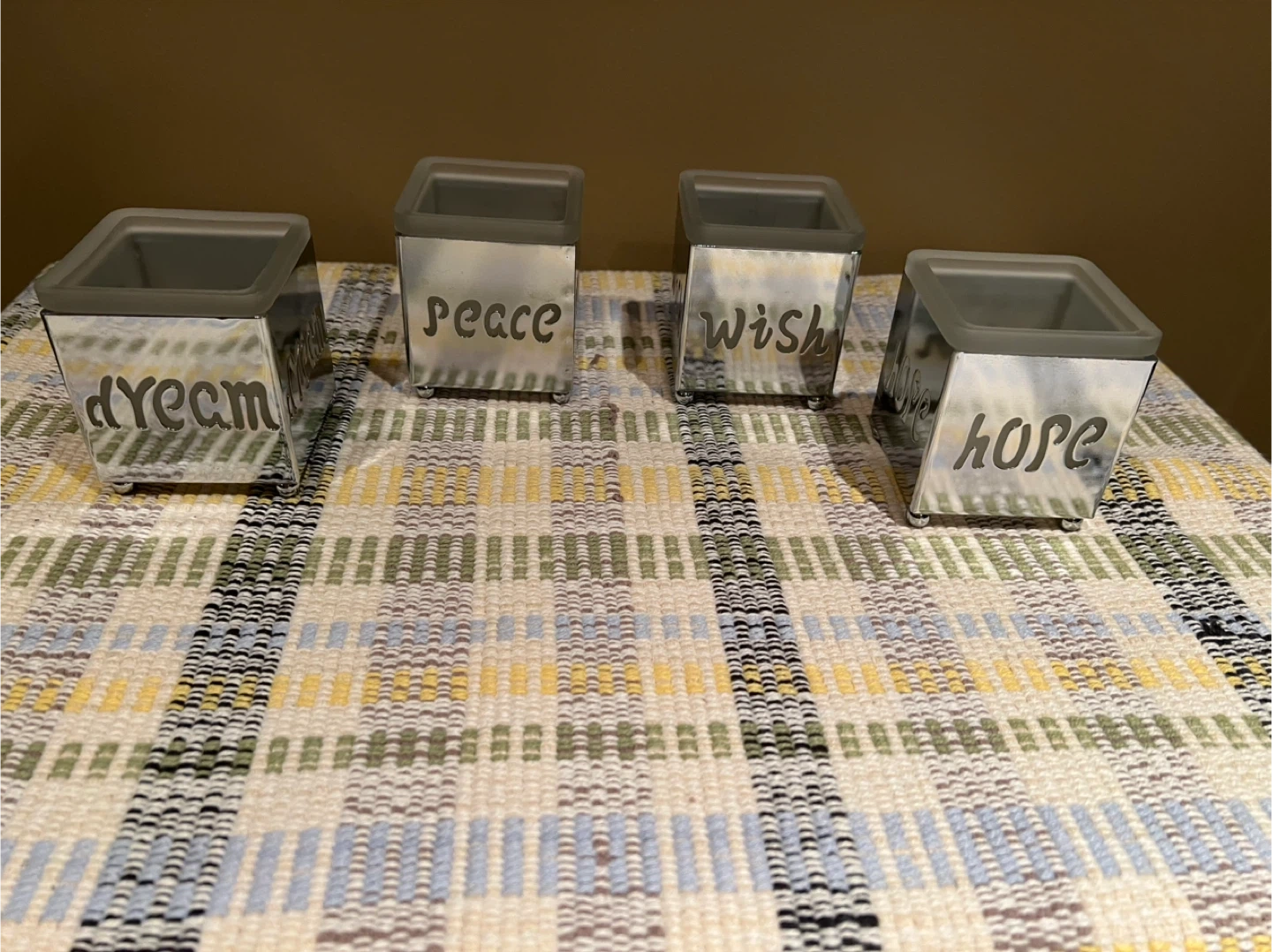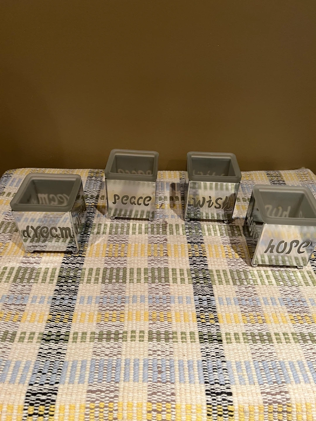 178Selling a set of four cute candle holders! Each one has a different word etched on it: Dream, Peace, Wish, and Hope. They're in great condition and would look lovely in any room