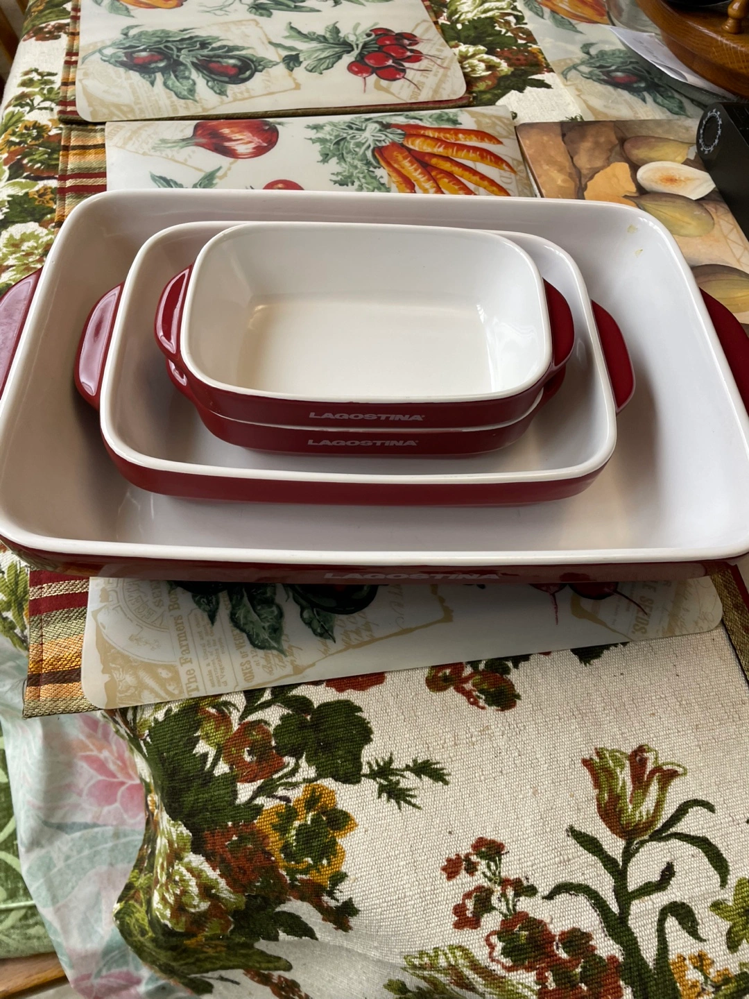 Selling a Lagostina baking dish set. It includes four dishes in large medium and 2 small in sizes, all in a lovely red colour. Perfect for all your baking needs cash only please no e-transfers thank you