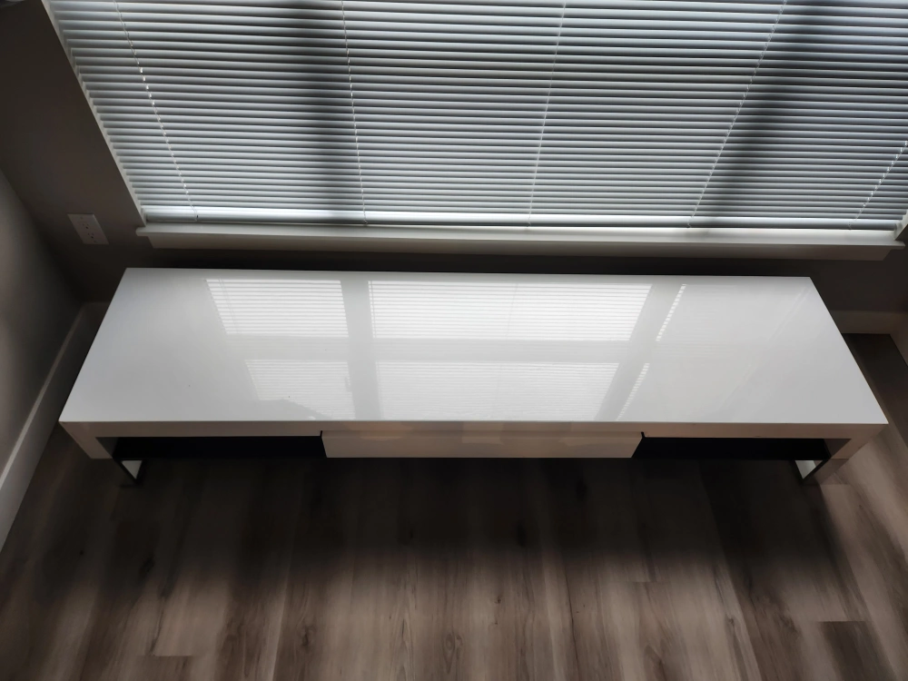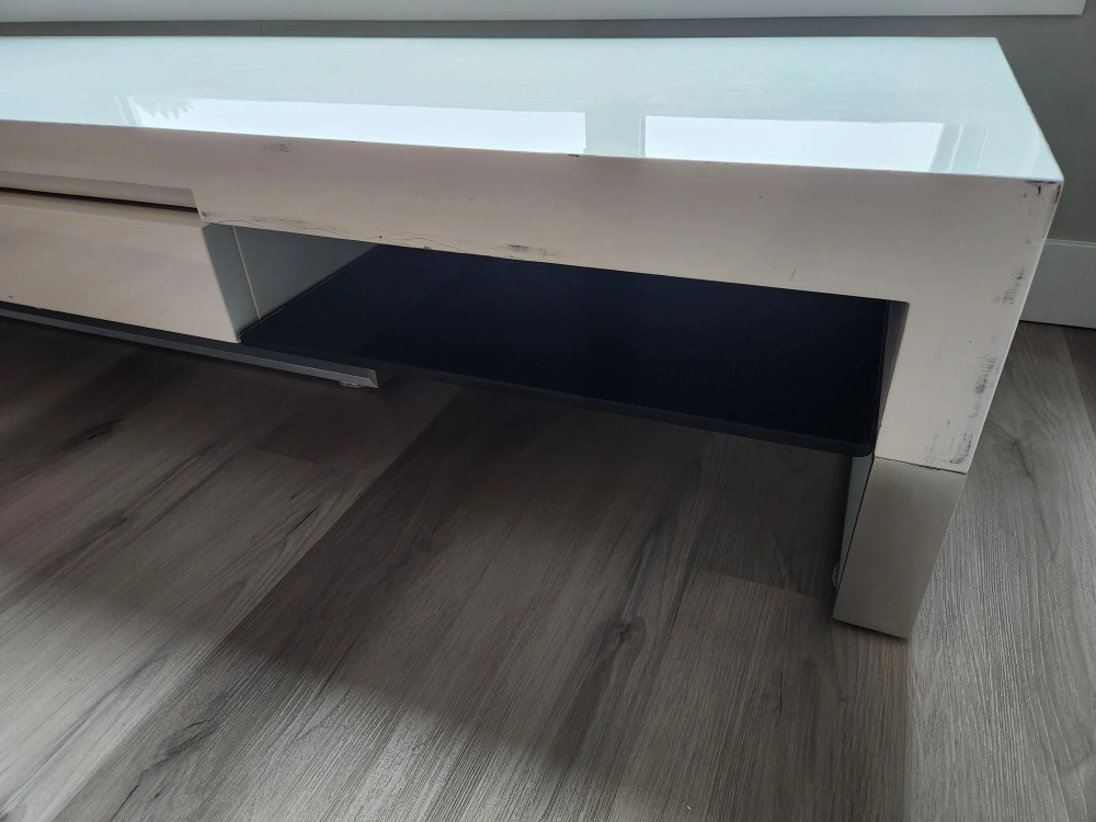 Selling a white TV stand that would look great in any living room! It has a sleek, modern design with a handy drawer for storage. There are some signs of use, as shown in the pictures, but it's still a functional and stylish piece of furniture