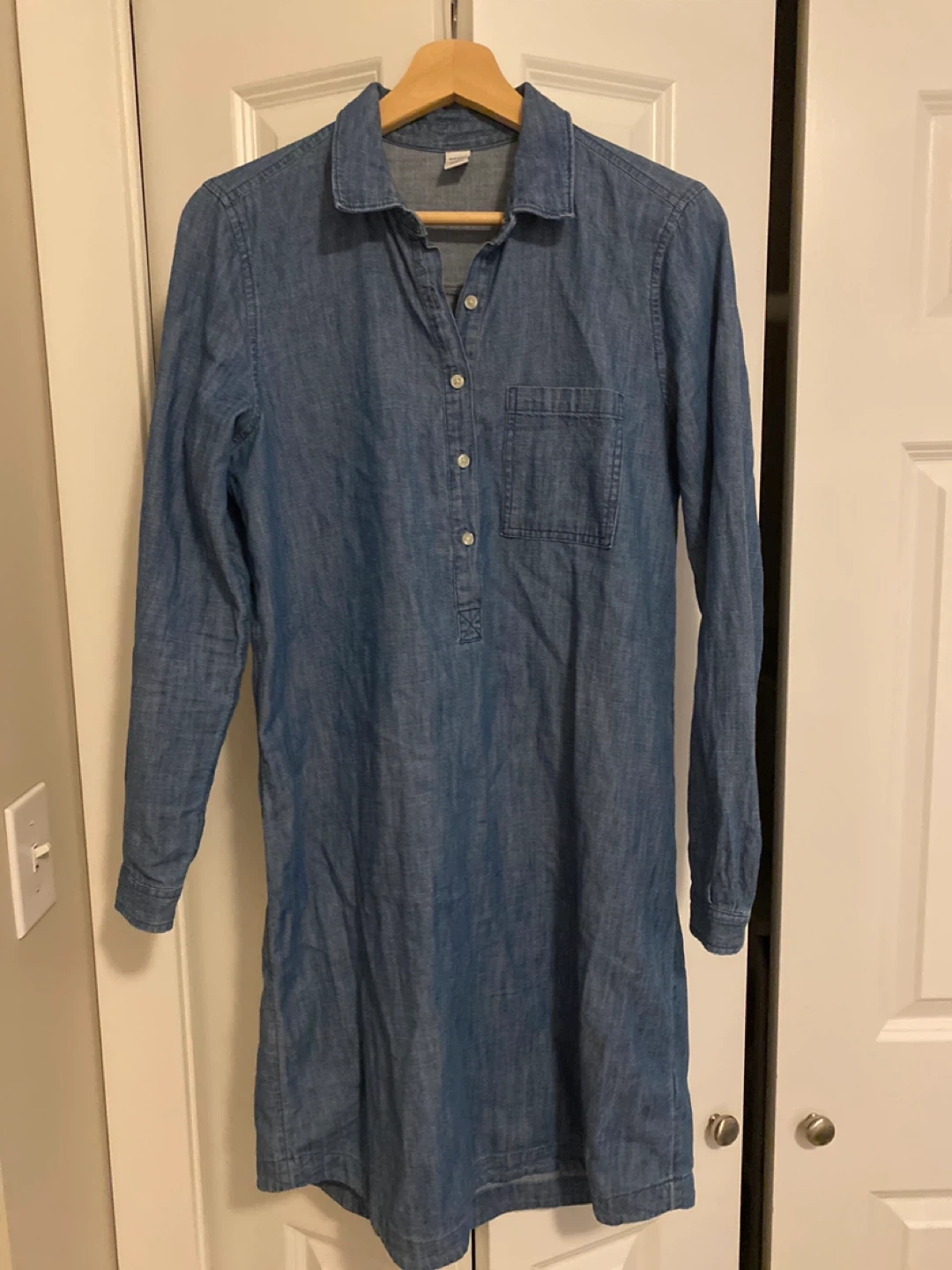 Old Navy denim shirt dress in a size small. It's a classic and versatile piece that can be dressed up or down. Perfect for a casual day out or a weekend getaway. Only worn twice.