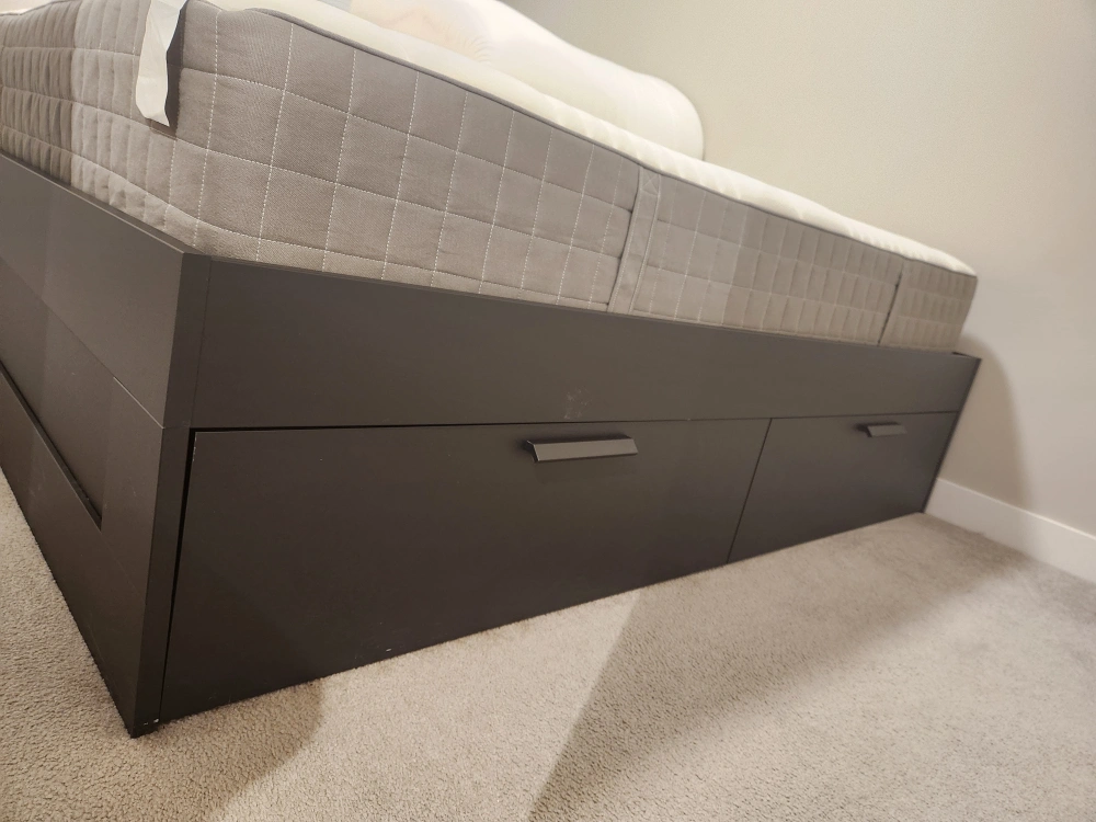 Selling a king size bed frame with built-in storage drawers! It's in great condition and provides lots of extra space for your belongings. The dark colour is neutral and will fit in with any decor.