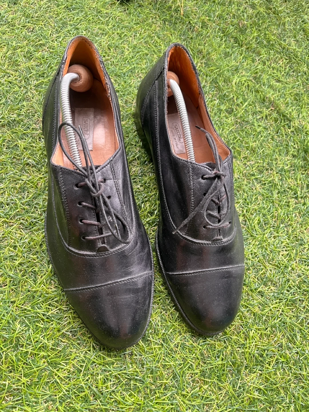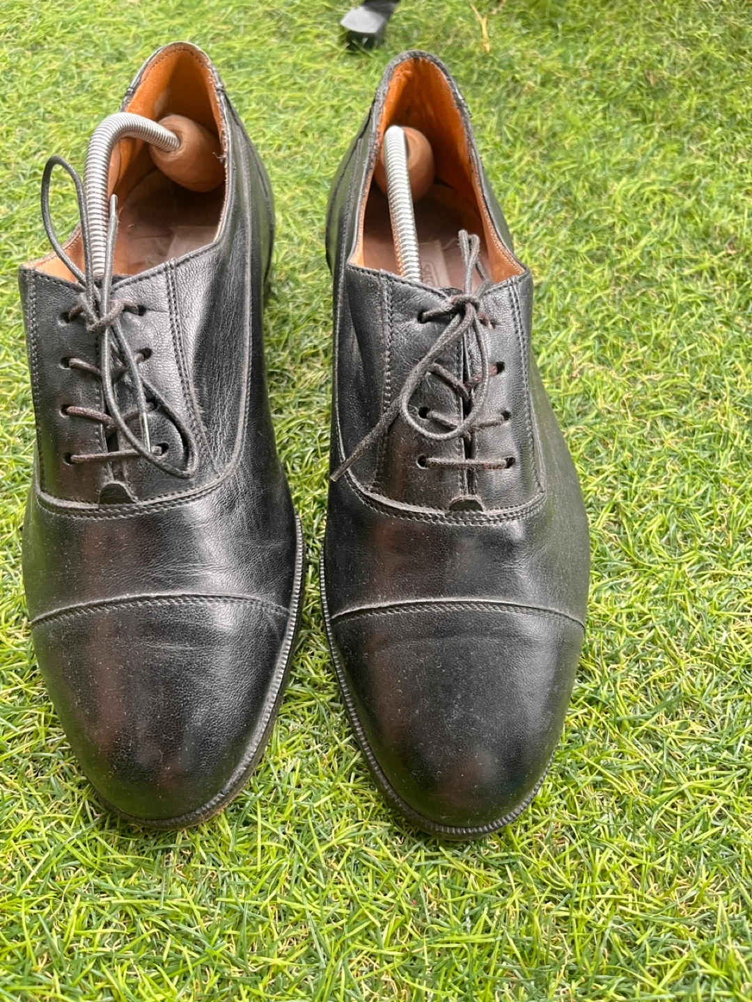 Classic black leather dress shoes by Sartoria, made in Italy! These are a size 7 men’s and feature a lace-up design. They show some signs of wear, but still have lots of life left in them