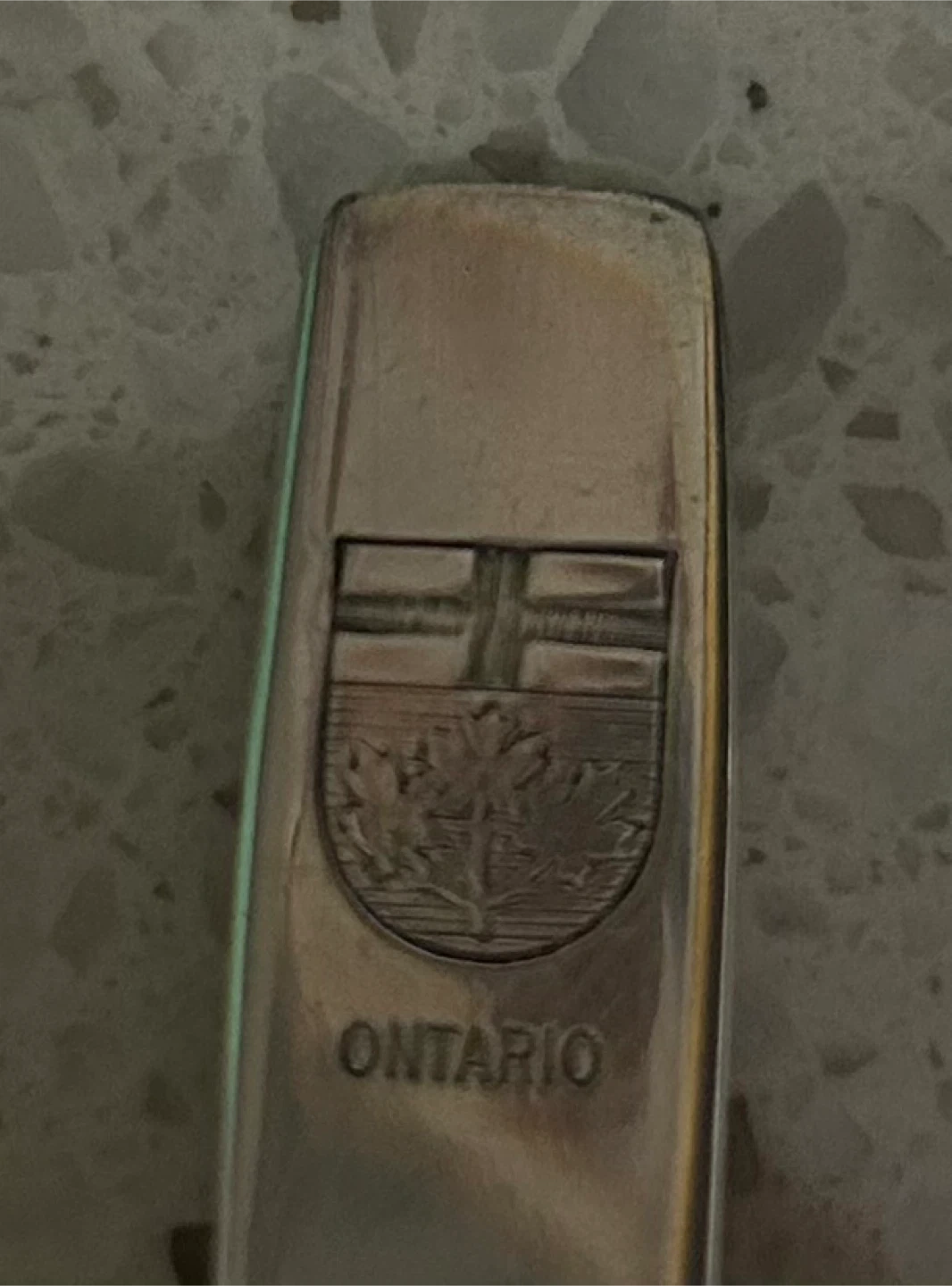 Here's a set of four vintage Oneida LTD silver plated spoons. They feature a unique design with the Ontario logo. These spoons are in good condition for their age and would be a great addition to any collection or for everyday use
