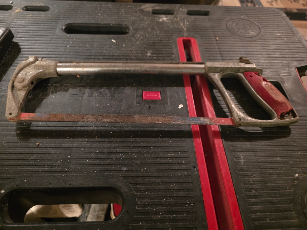 59Selling a used hacksaw. It has a red handle. It shows signs of wear and rust on the blade. It would be great for small projects around the house