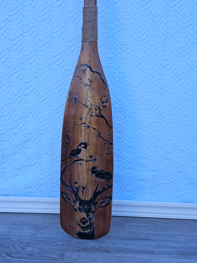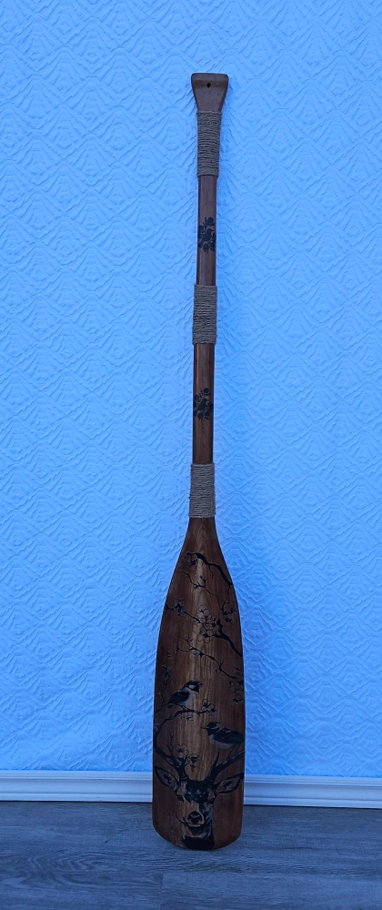 10Selling a unique re-finished decorative wooden paddle. It features a lovely design with a deer and birds. Perfect for adding a rustic touch to your home decor! W 7 1/2" x H 60"