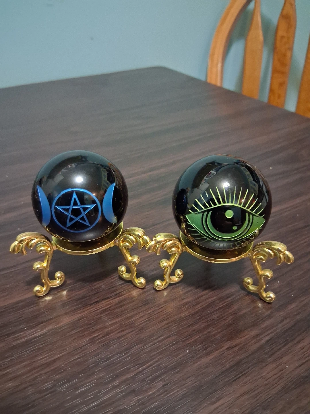 452Two decorative black glass orbs with stands. One has a blue pentagram design, and the other has an eye design. They come with gold-coloured stands to display them on