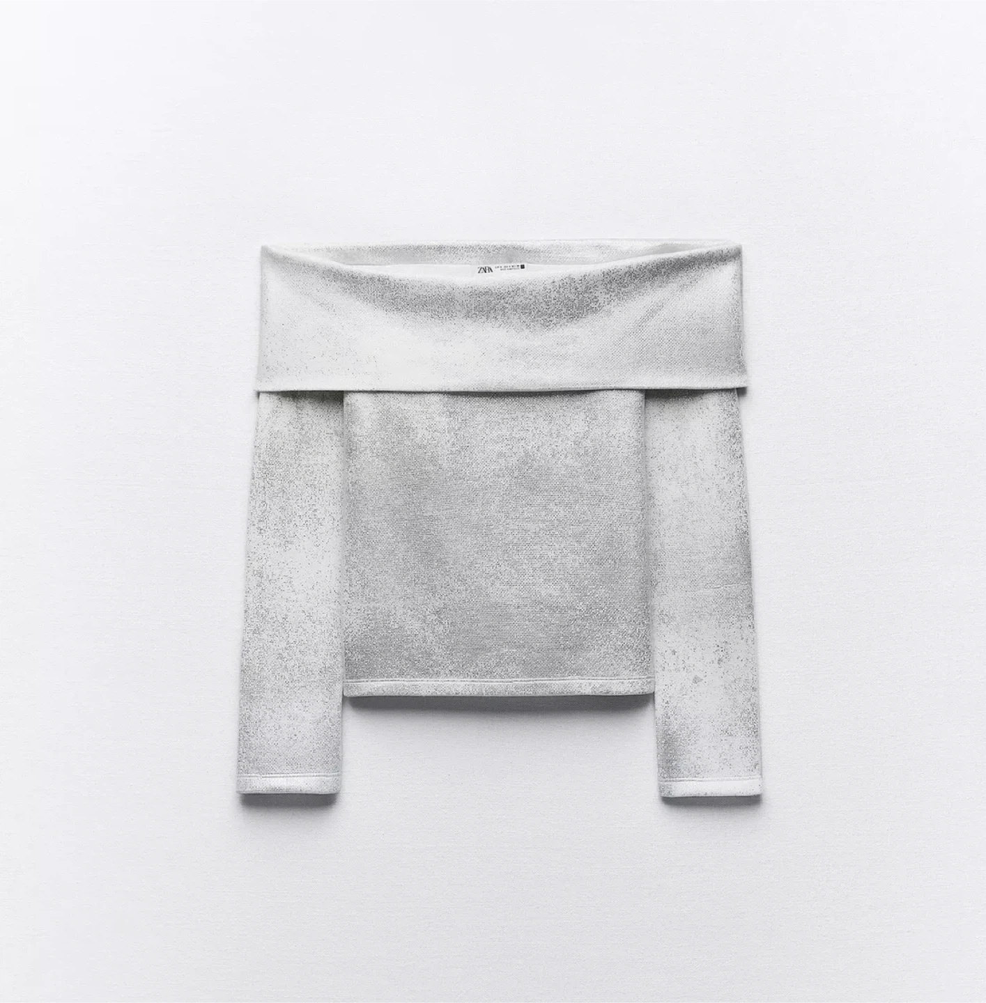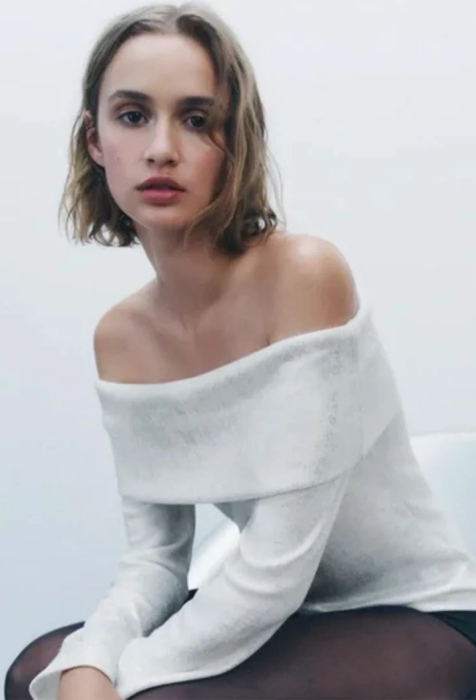 1000+Selling a Zara off-the-shoulder knit top Size - small It's a beautiful silver colour and looks great dressed up or down! The material is soft and comfortable, perfect for any occasion Original tag attached Never worn Price is firm Cash Only Pick up please