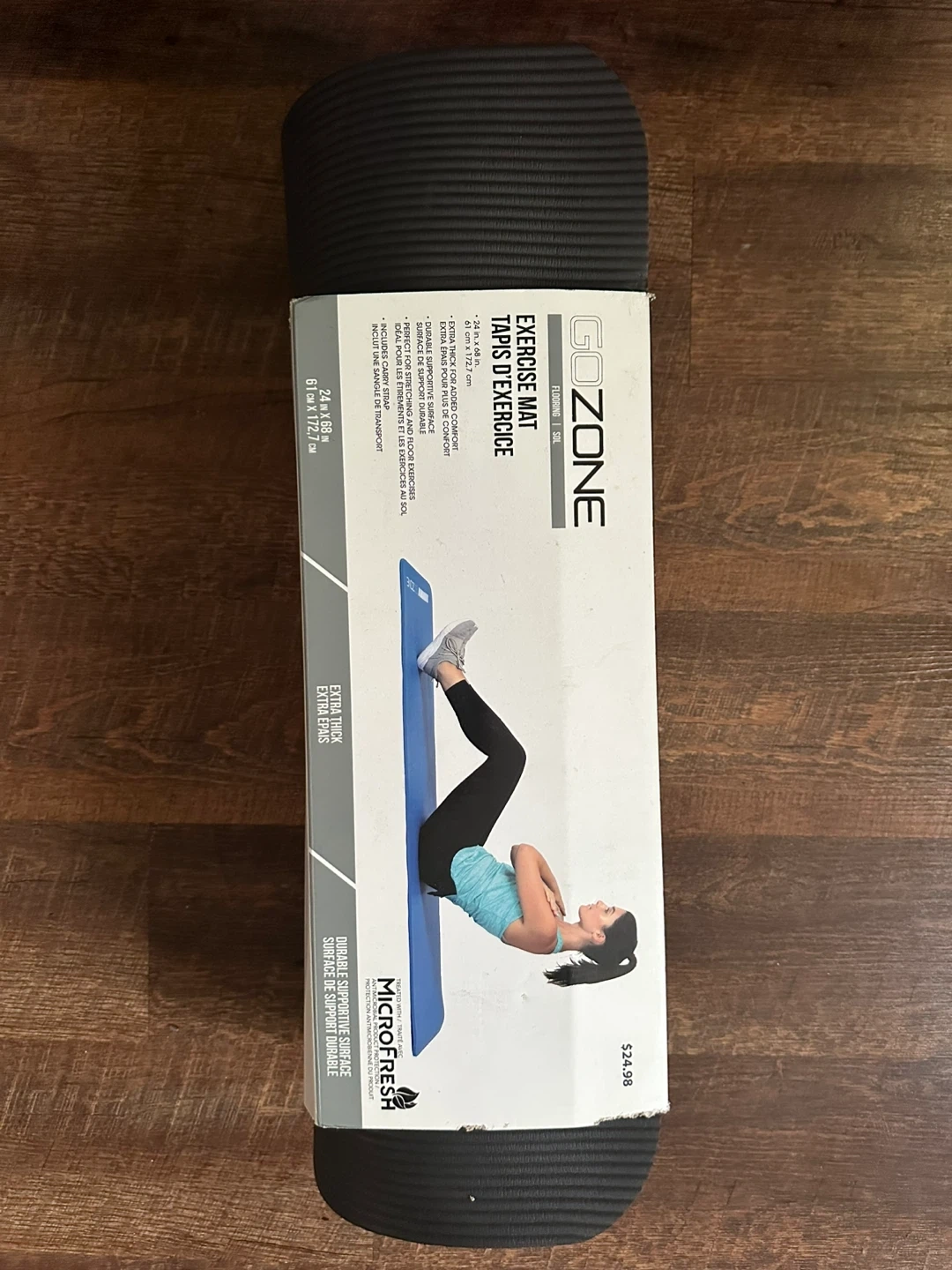 Selling a Go Zone exercise mat in excellent condition! It's extra thick for comfortable support during your workouts. Dimensions are 24 in x 68 in (61 cm x 172 cm). Originally bought for $24.98. Get ready to stretch and strengthen!