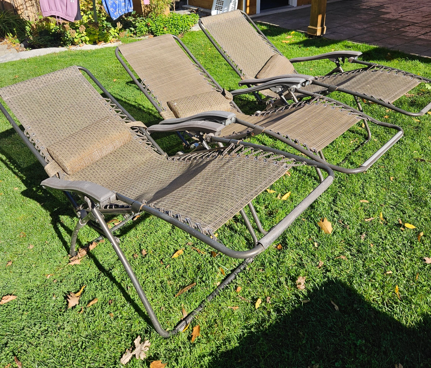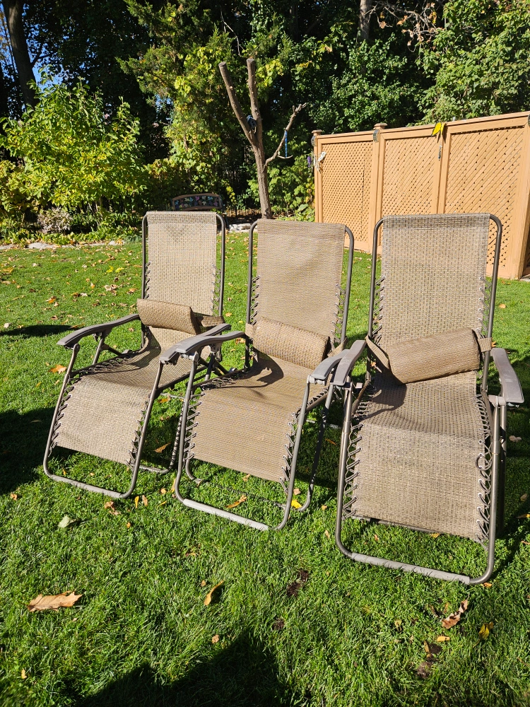 Selling a set of three zero gravity lounge chairs. They're perfect for relaxing in the backyard or on the patio. They are in good condition and ready for a new home!