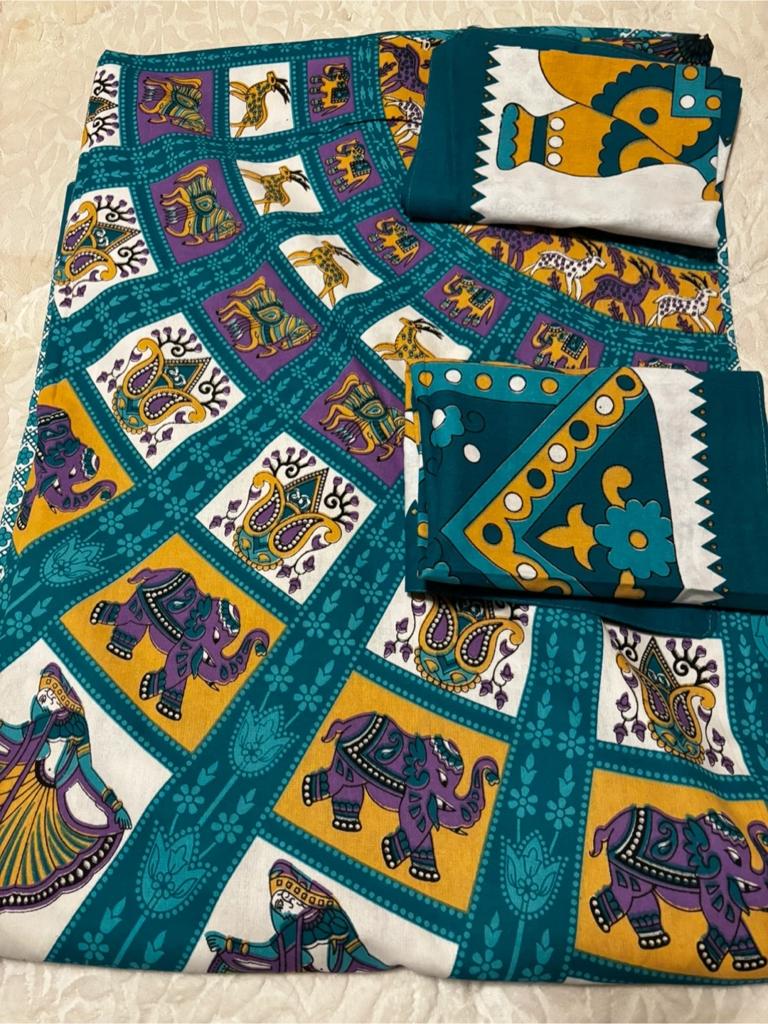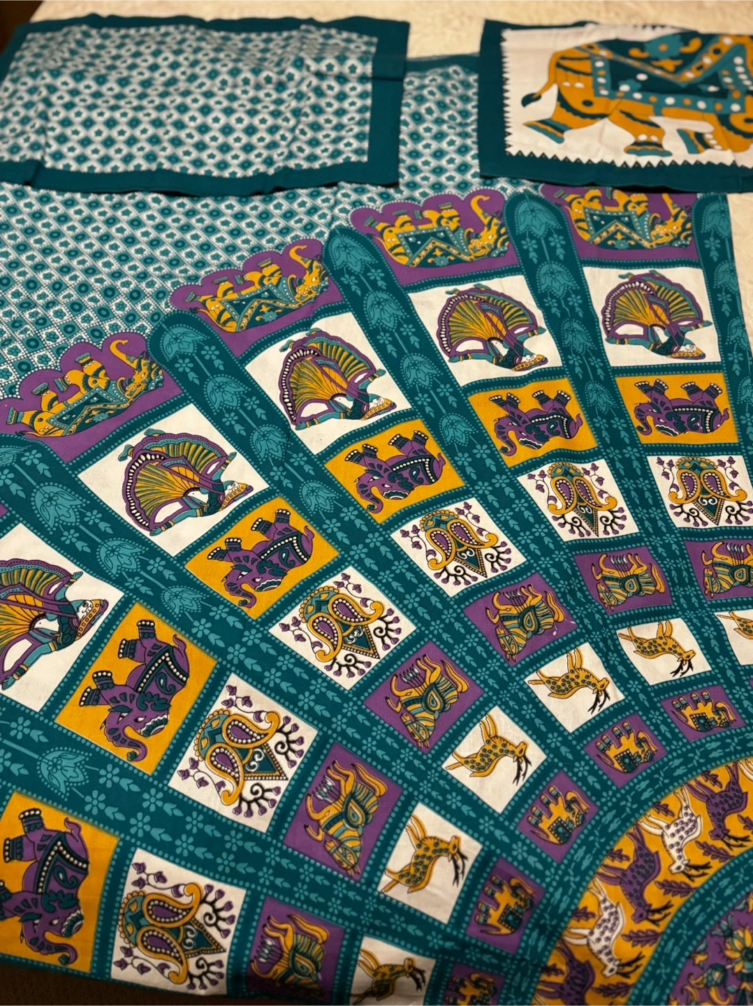 41Selling a beautiful bedding set featuring a teal, purple, and yellow colour scheme! The set includes pillowcases and a patterned bedspread. The patterns include elephants and floral designs. Perfect for adding a vibrant touch to your bedroom! Made in India. Note that the pillow cases could be a bit smaller than the adult size pillows here.