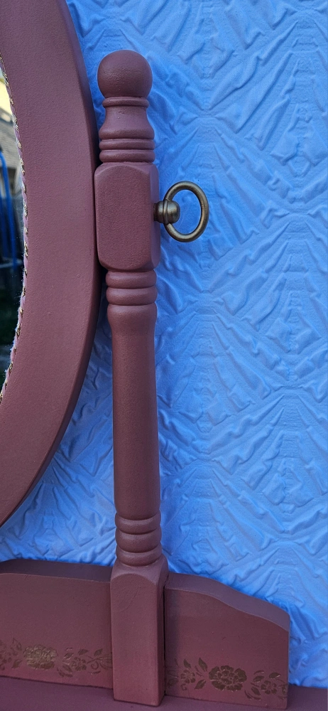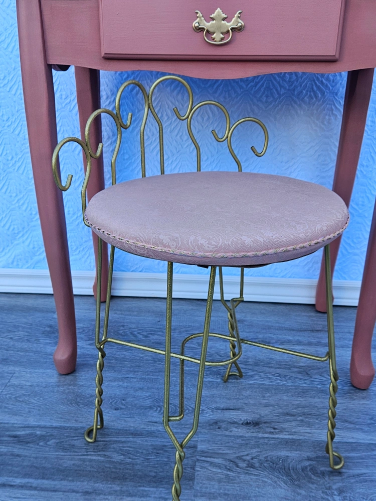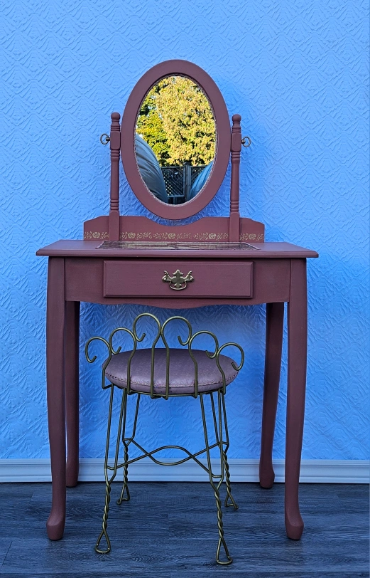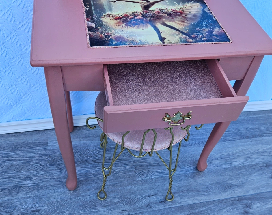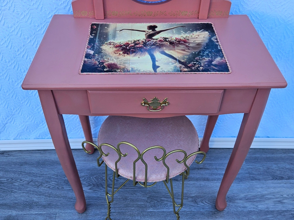 10Selling a re-finished solid wood charming pink vanity table complete with a stool and mirror! It features a lovely ballerina image on the tabletop and gold floral accents. The vanity also has a drawer for storage with pink glitter liner and a peek-a-boo floral design on the side of the drawer and a gold antique handle. Perfect for keeping your essentials organized. The gold glitter vintage iron stool features an easy to clean pink vinyl seat. L 28" x W 16" x H 30" tabletop. Total Height including mirror is 51"