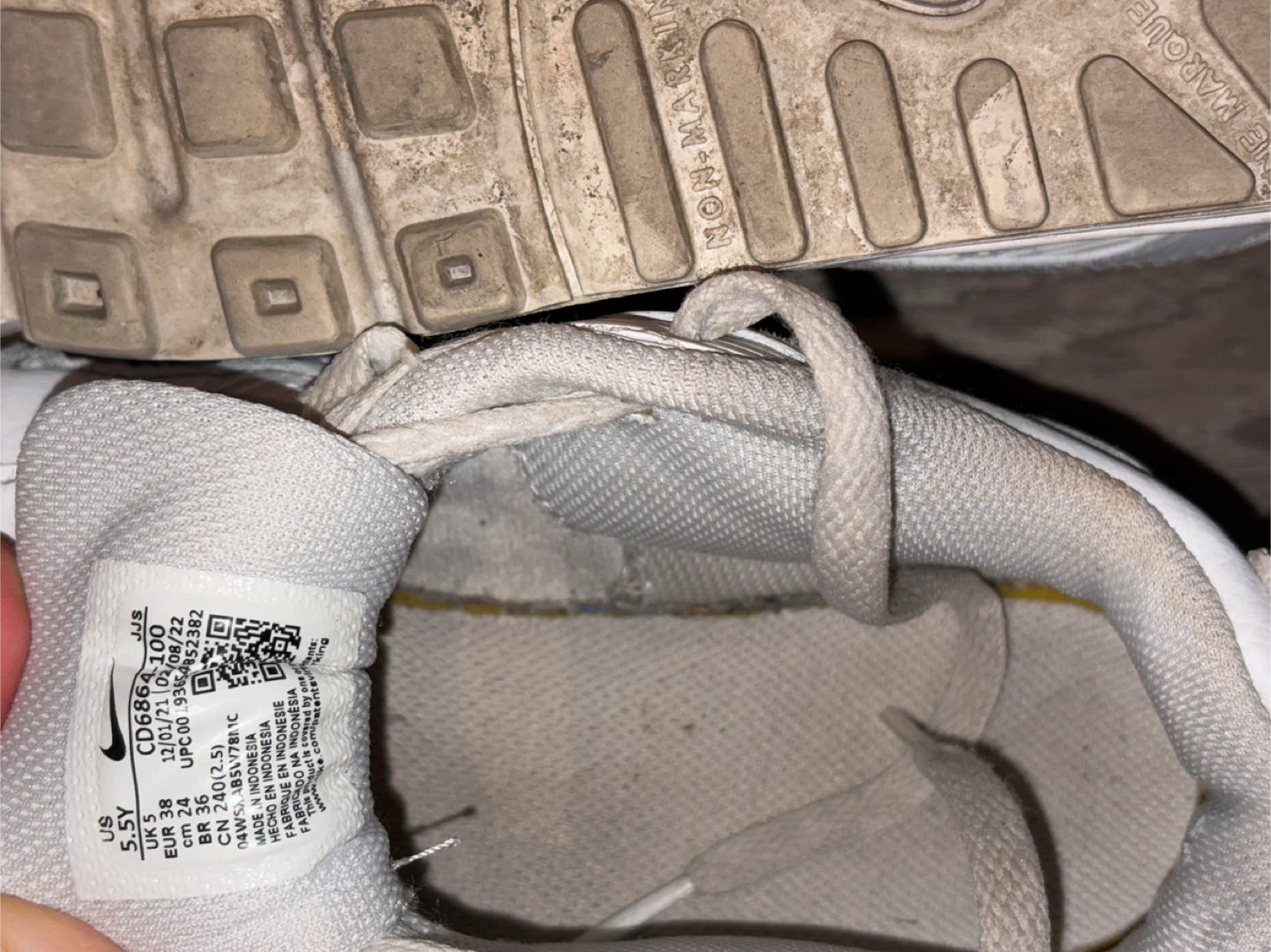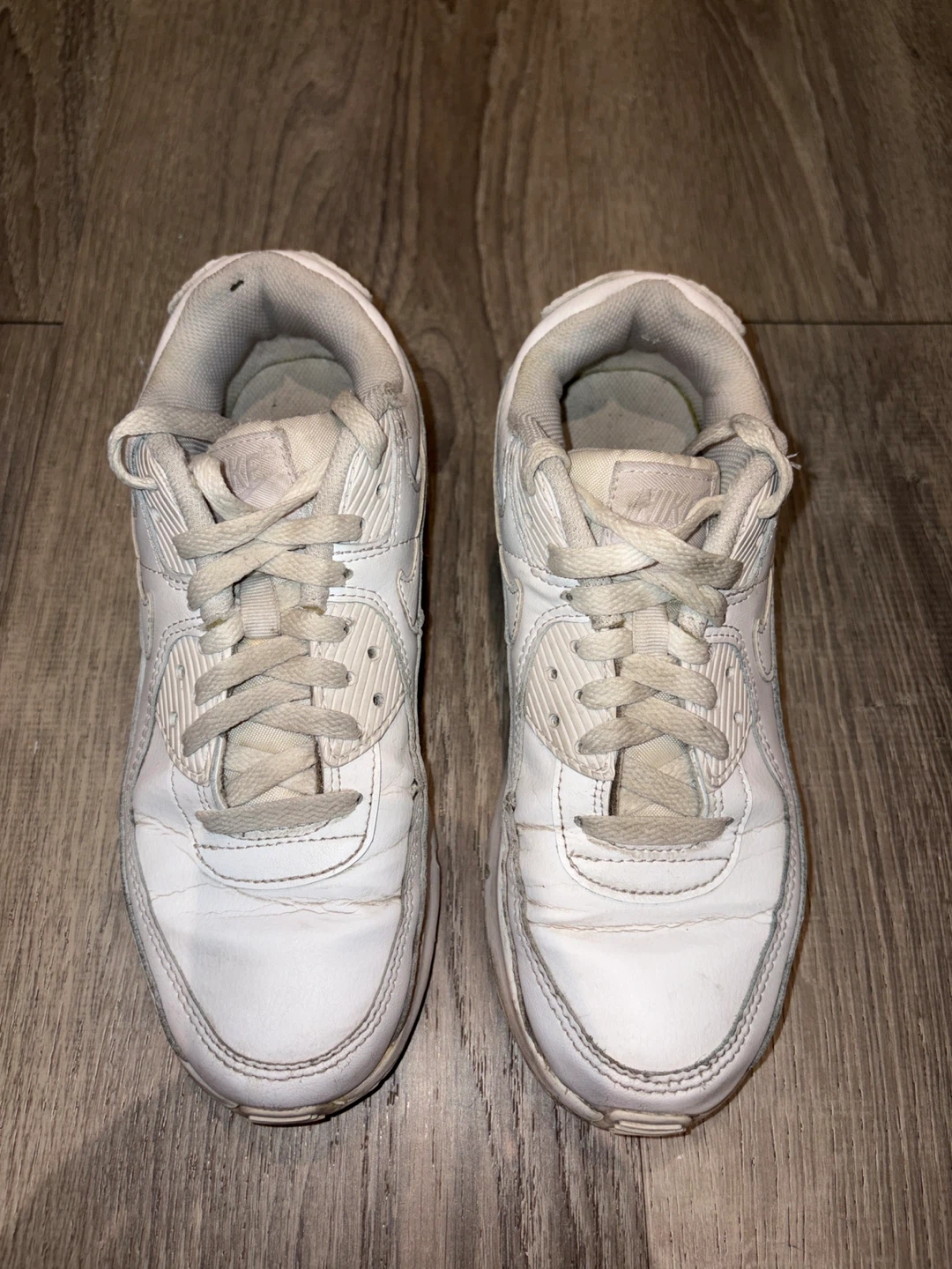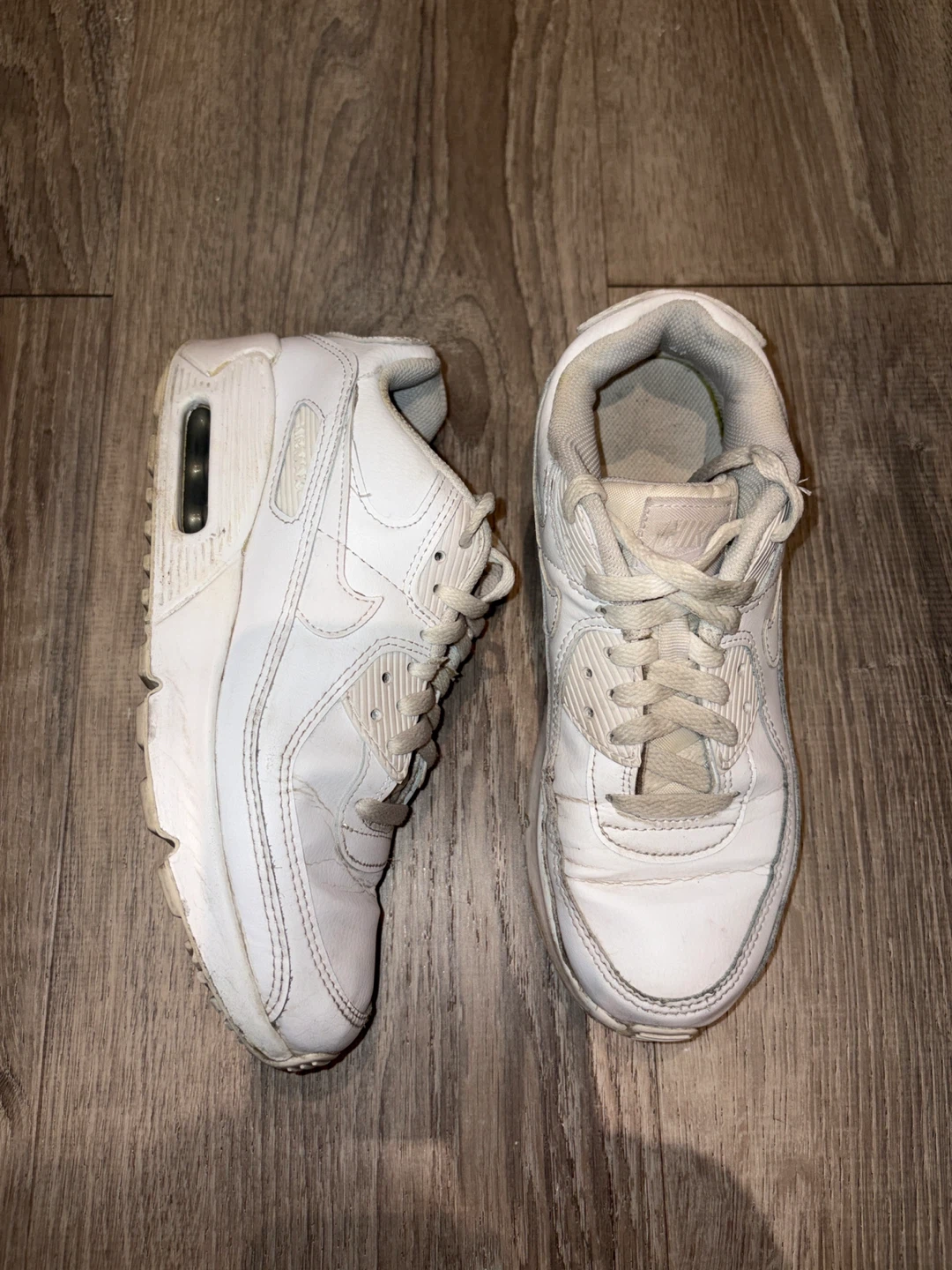 Selling a pair of Nike Air Max 90s in white. They're in youth size 5.5/women’s 7. They show some signs of wear, but still have lots of life left!