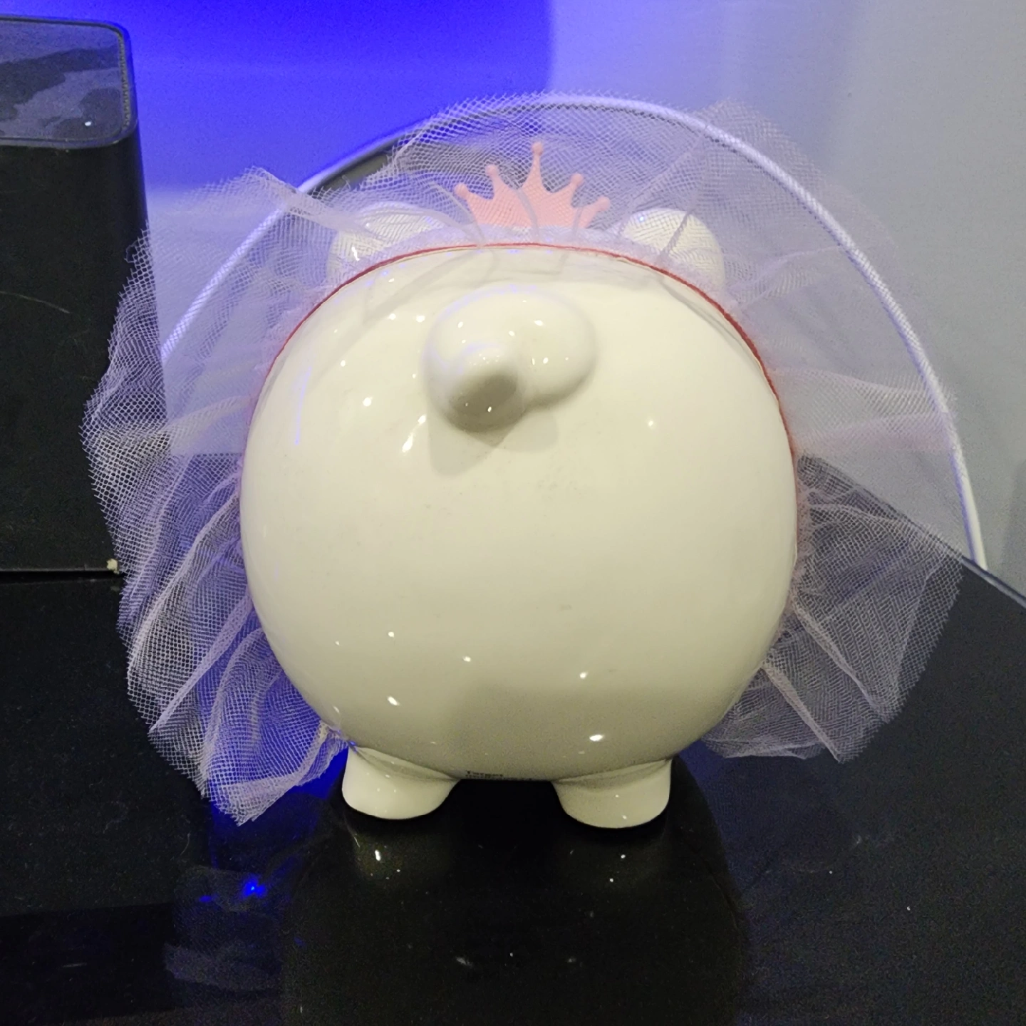 This adorable piggy bank is ready to watch over your savings! It's a white ceramic pig with a cute pink crown and a little tutu. Perfect for a kid's room or anyone who loves a bit of whimsy