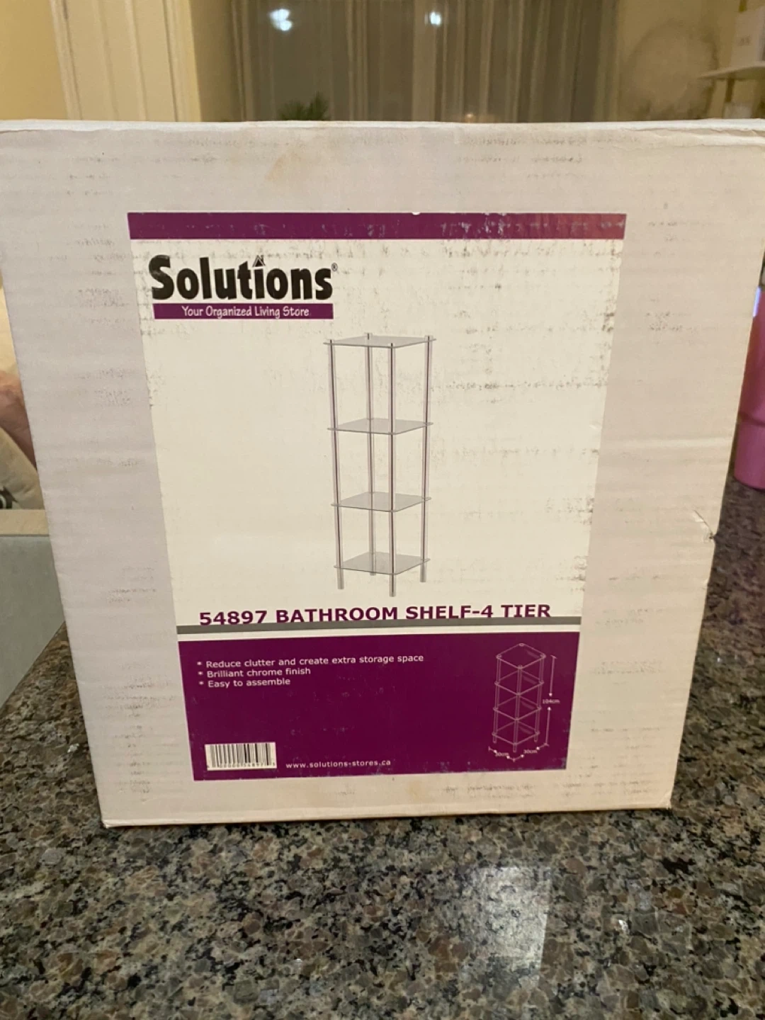 18Selling a brand new Solutions 4-Tier Bathroom Shelf still in its original packaging! It's perfect for reducing clutter and adding extra storage space in your bathroom. The shelf has a brilliant chrome finish and is easy to assemble, according to the box