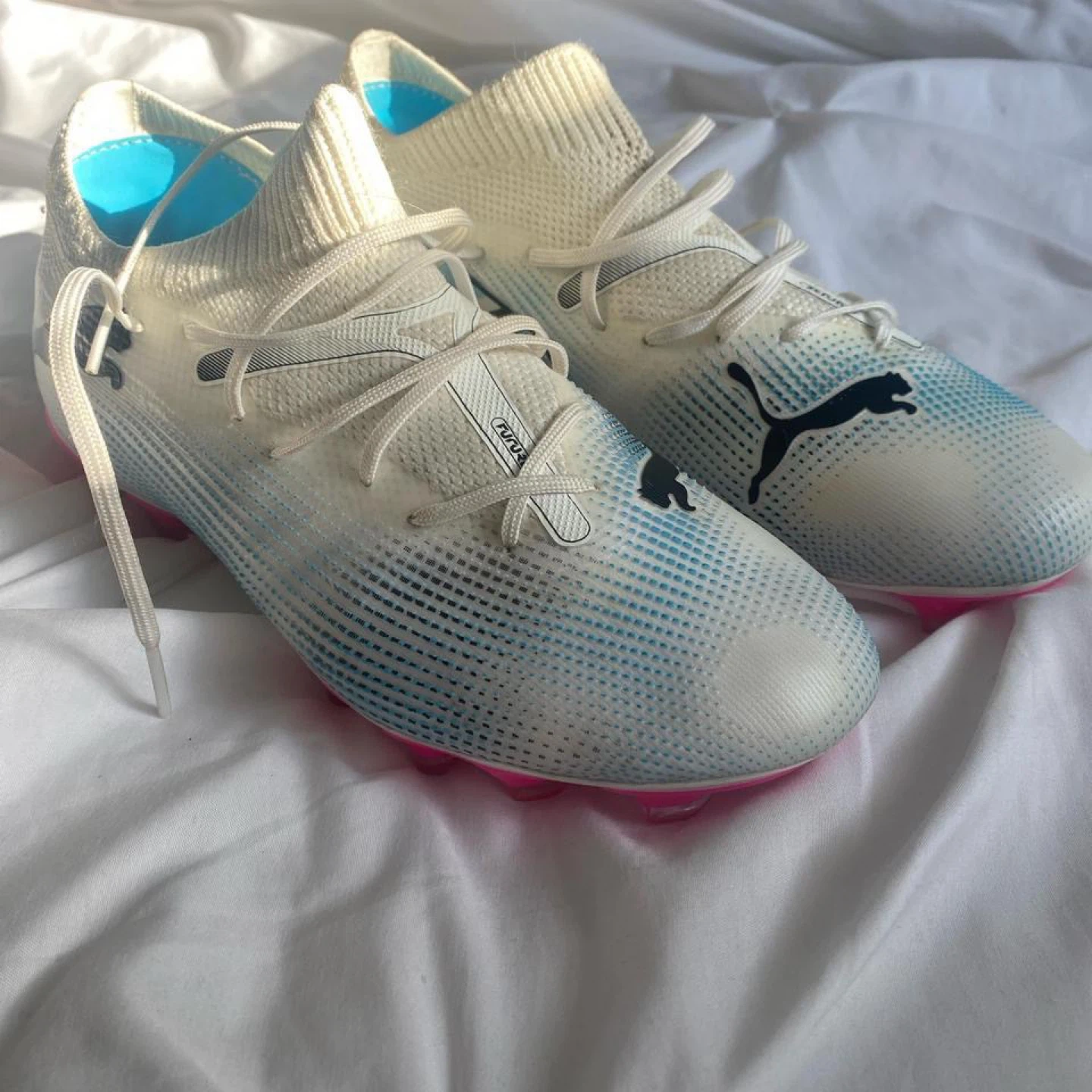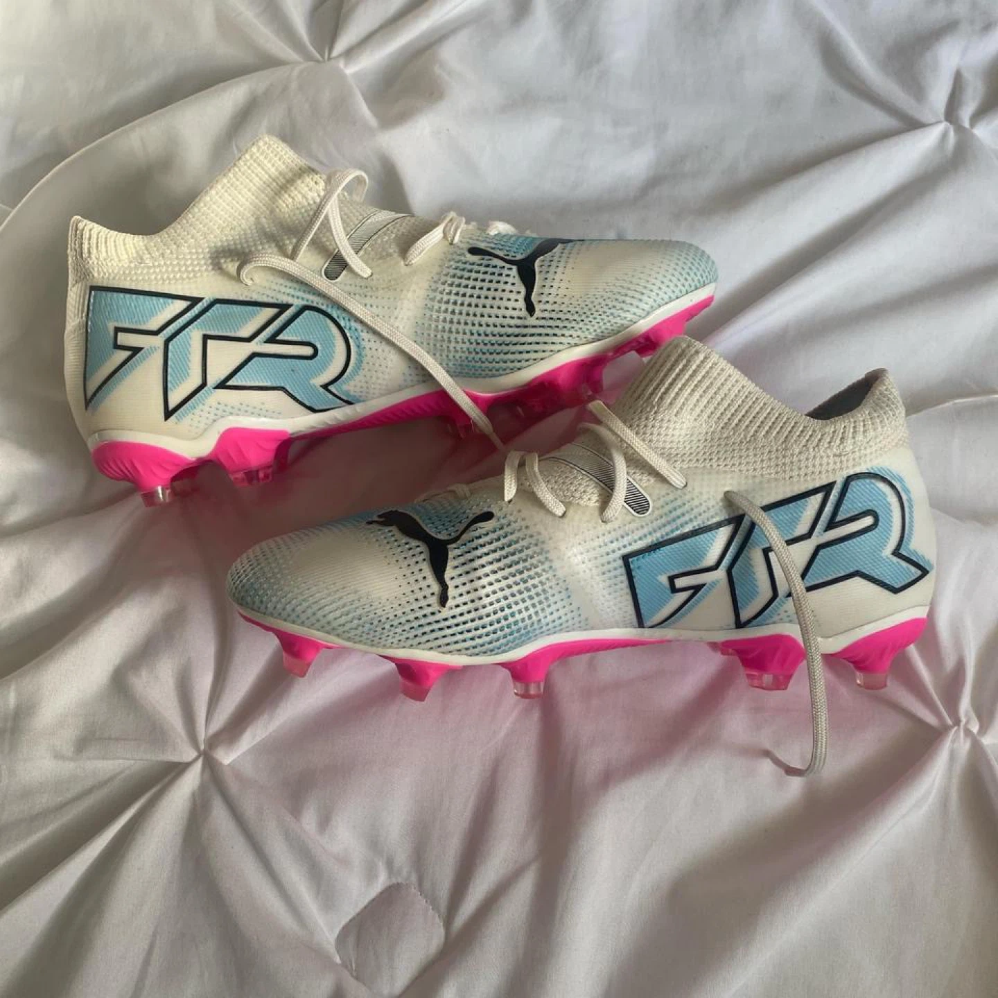 Selling a pair of Puma Future 7 Match FG/AG women size 6 soccer cleats. They are in good condition, only used once and ready for the field! The cleats feature a stylish design with a white, blue, and pink colour scheme. Perfect for your next game or practice!
